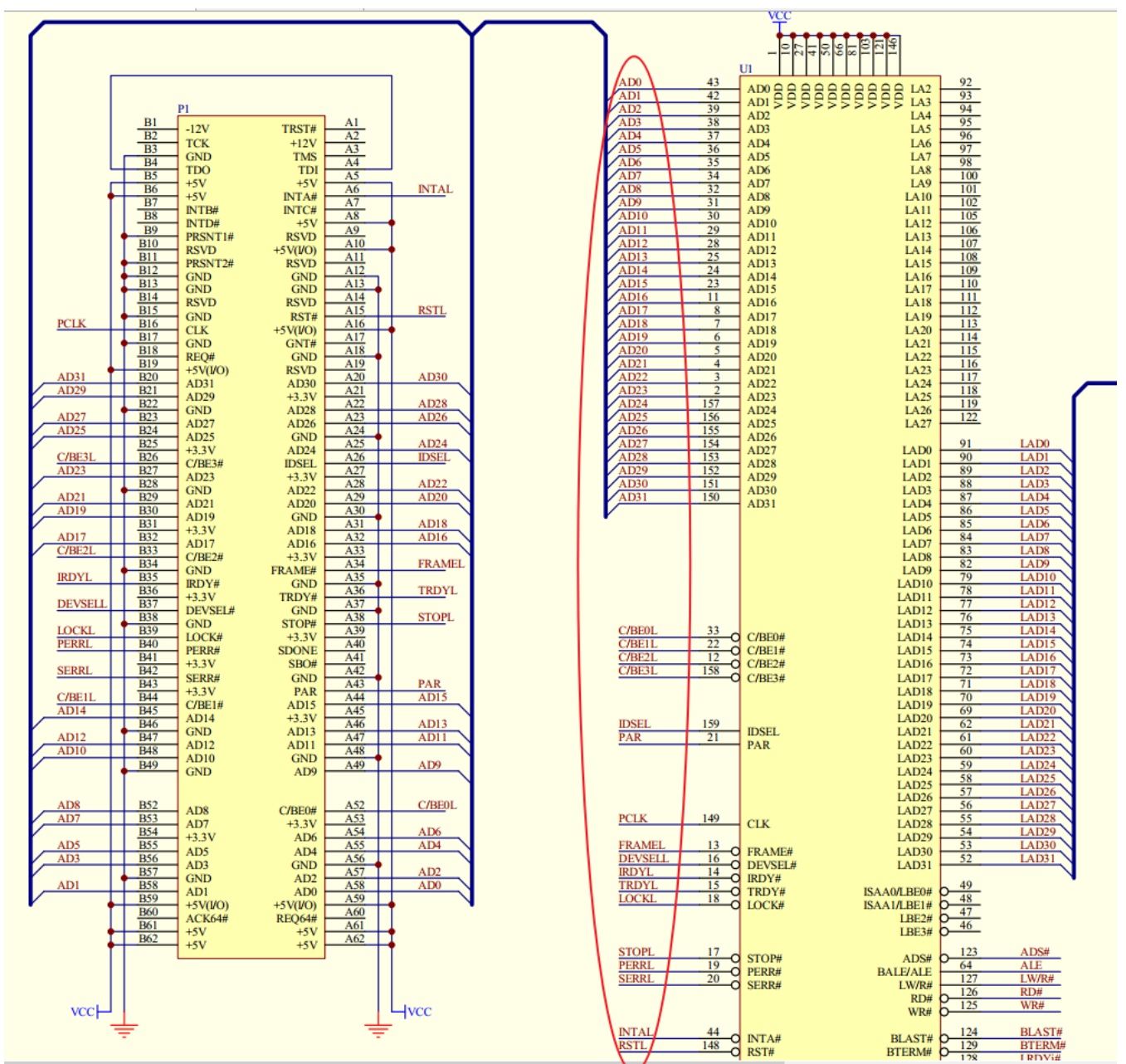 | 地址/数据引脚 | AD[31:00]:地址、数据复用 C/BE[3:0]:命令或者字节使能 PAR:校验引脚 | |