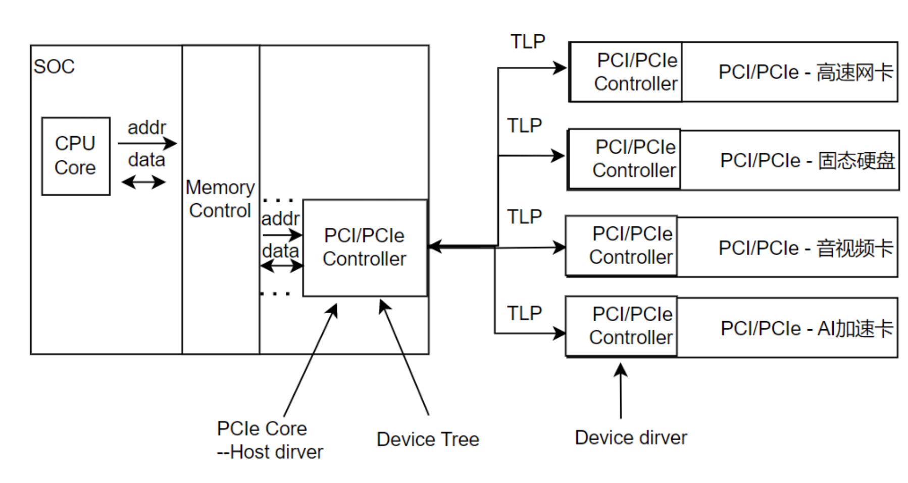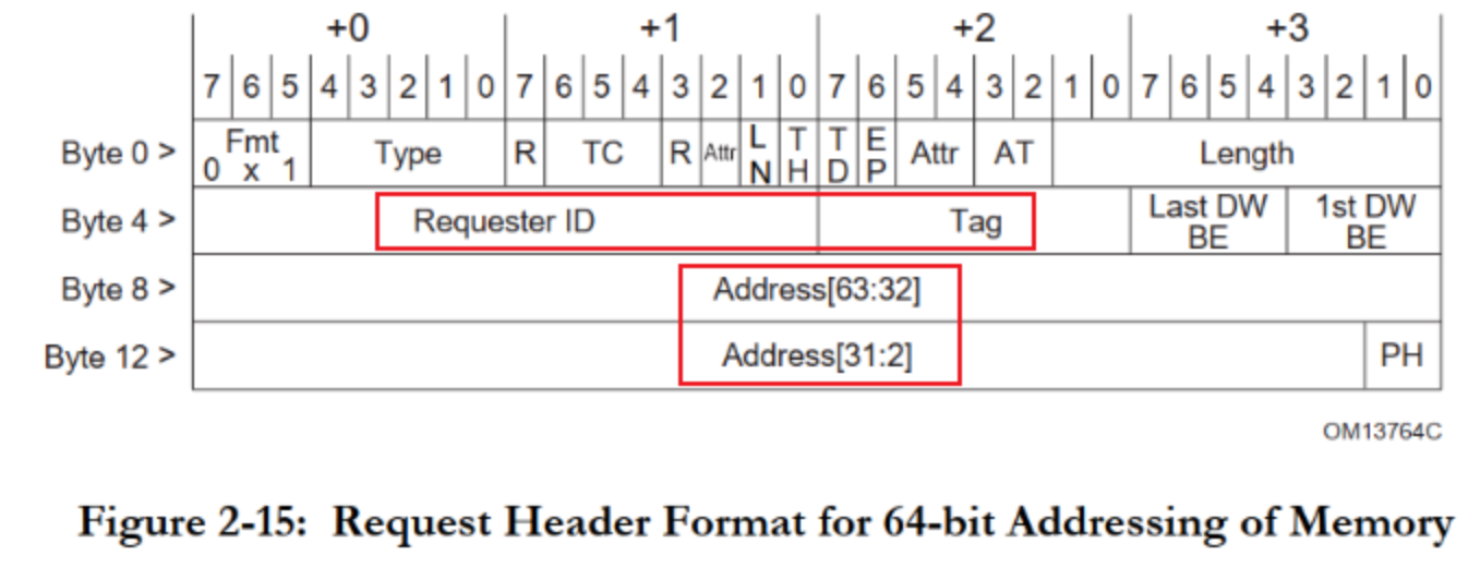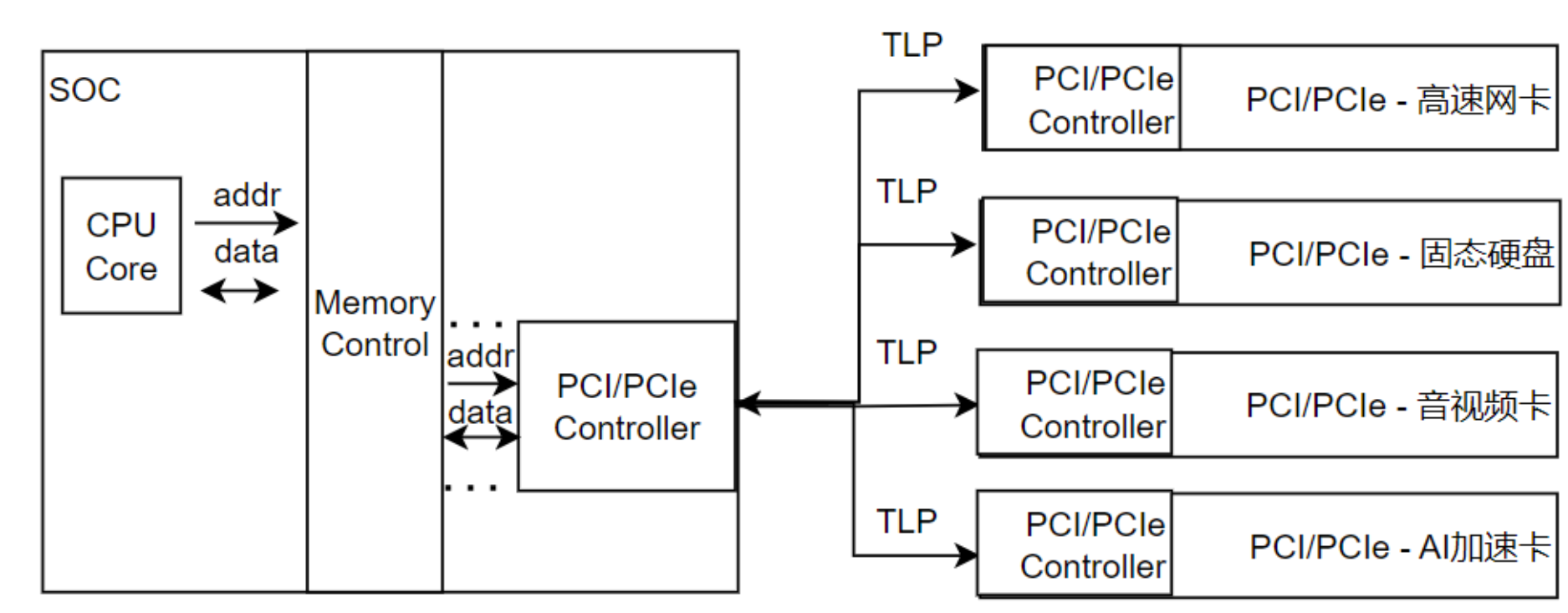 1、CPU发出地址,经过内存控制器选中PCI/PCIe控制器,控制器会构造TLP包通过总线发送出去,PCI/PCIe设备监听解析总线上的TLP包,如果地址落在自己的范围,便会处理TLP包的请求,处理完成后重新构造TLP包通过总线发送出去;