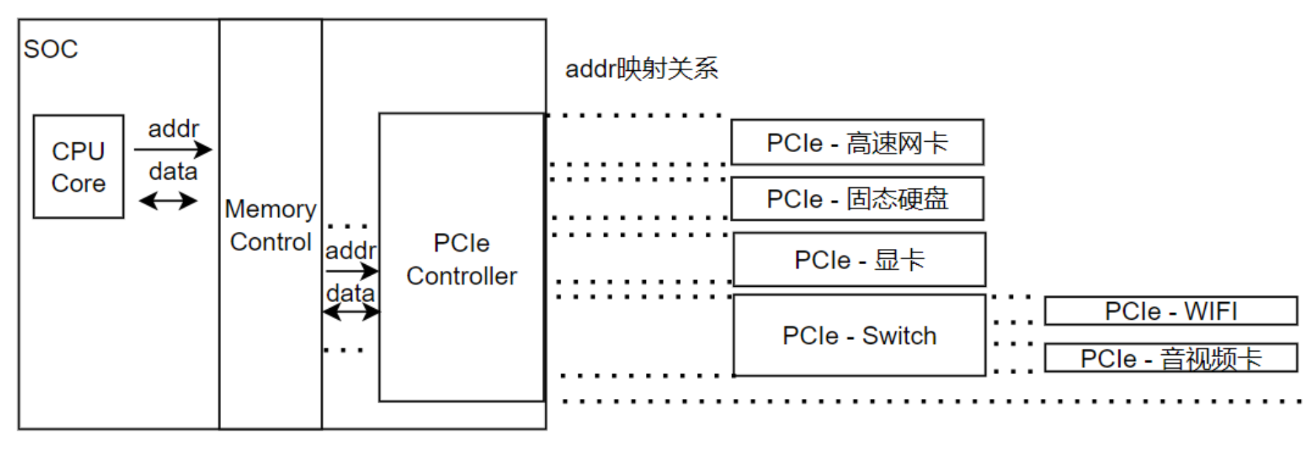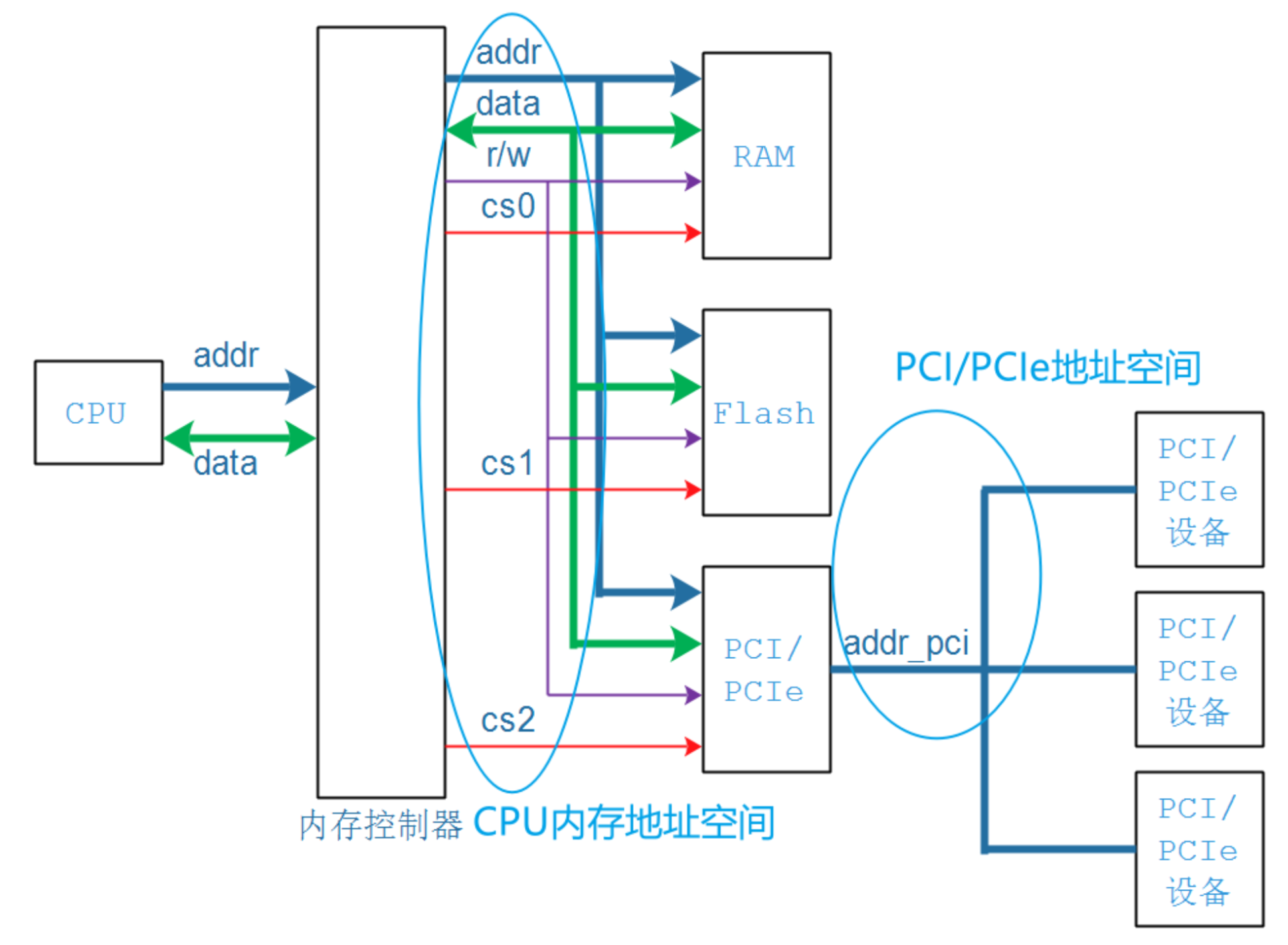 而现在,配置好PCIe控制器后,PCIe设备则可以像内存那样直接访问,CPU直接发出地址访问PCIe设备,由PCIe控制器进行处理,PCIe设备将数据原路返回给CPU;而这些I2C/SPI/UART控制器无法做到;