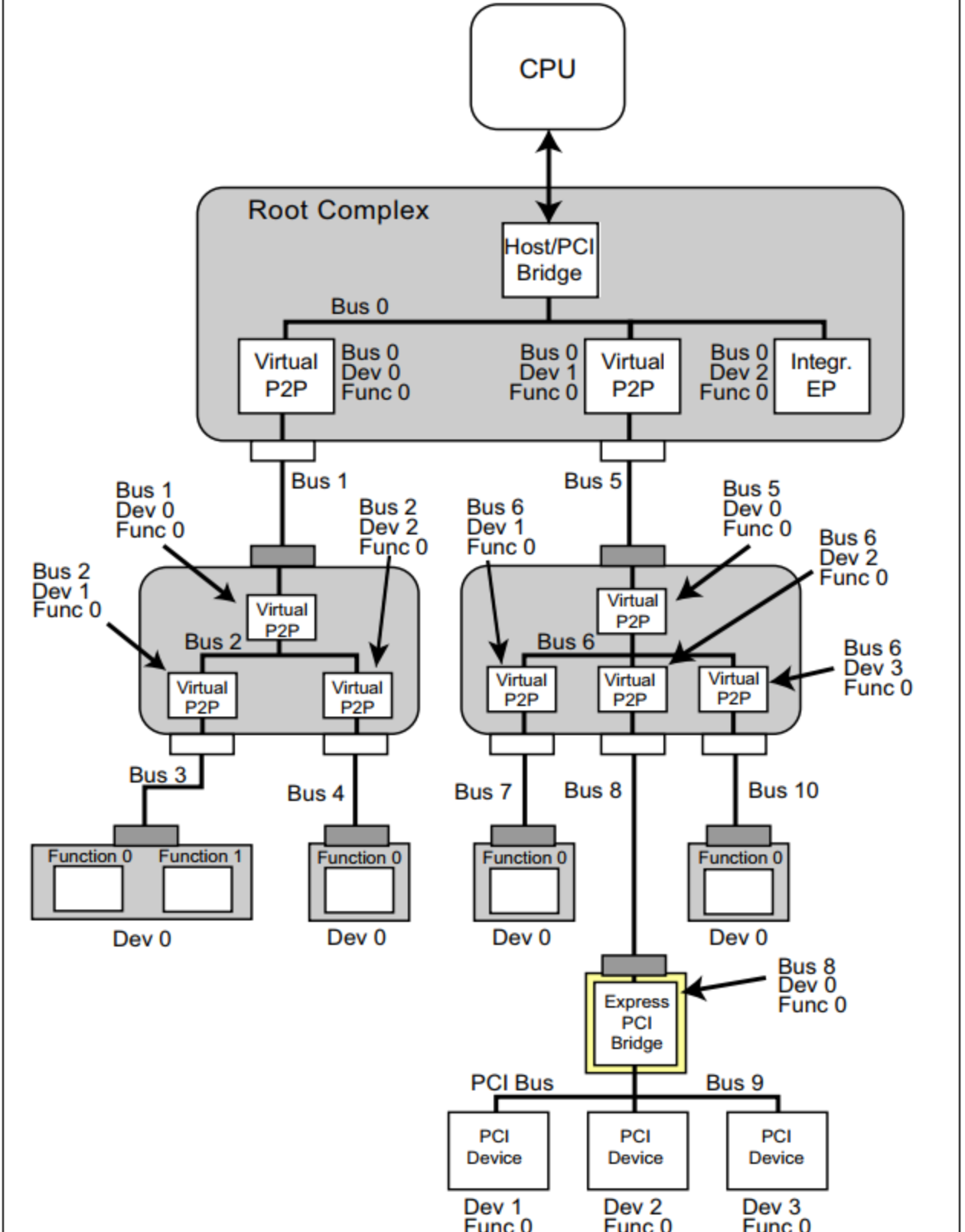 - PCI Bridge:桥,用来扩展PCI设备,必定有一个Root Bridge,下面还可以有其他Bridge。