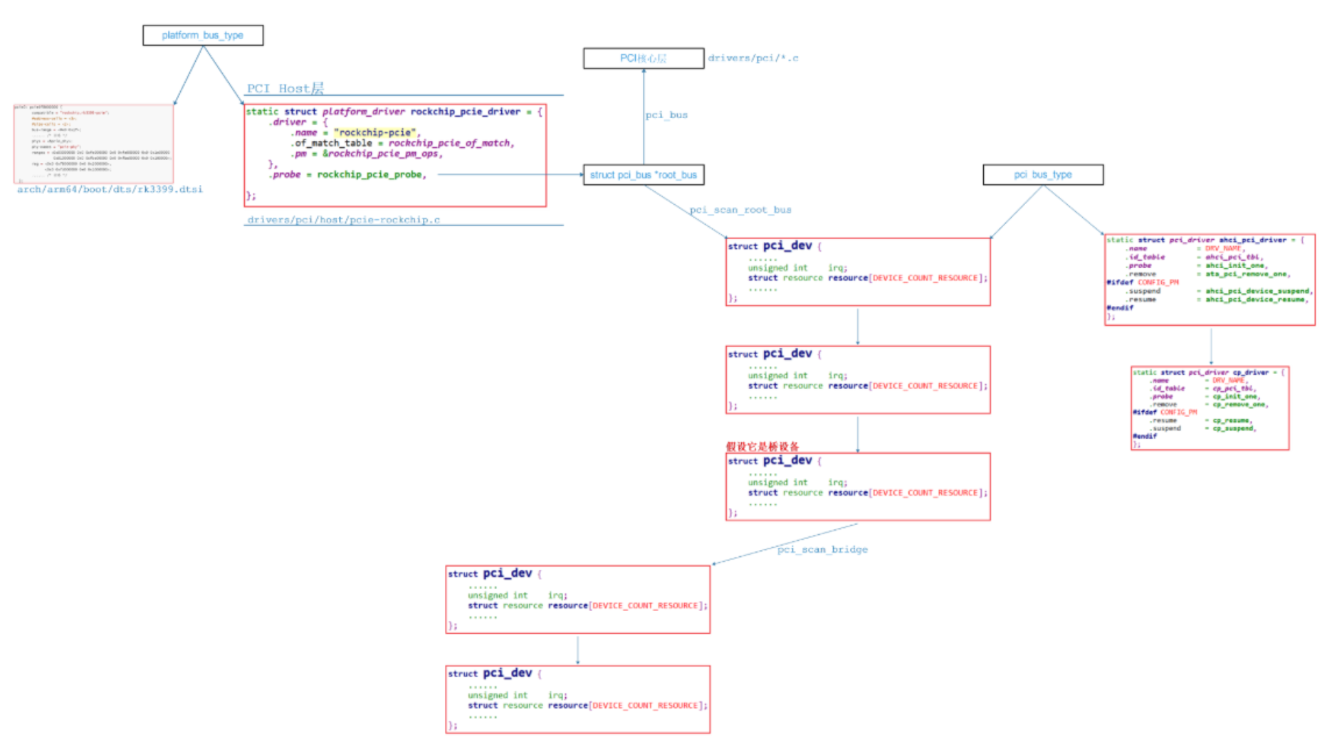 shellrockchip_pcie_probe bus = pci_scan_root_bus(&pdev->dev, 0, &rockchip_pcie_ops, rockchip, &res); pci_scan_root_bus_msi pci_scan_child_bus pci_scan_slot dev = pci_scan_single_device(bus, devfn); dev = pci_scan_device(bus, devfn); struct pci_dev *dev; dev = pci_alloc_dev(bus); pci_setup_device() //将读出来的信息填充到pci_dev结构体 dev_set_name(&dev->dev, "%04x:%02x:%02x.%d",...) pci_read_bases(dev, 6, PCI_ROM_ADDRESS); //读出BAR pci_device_add(dev, bus); -
