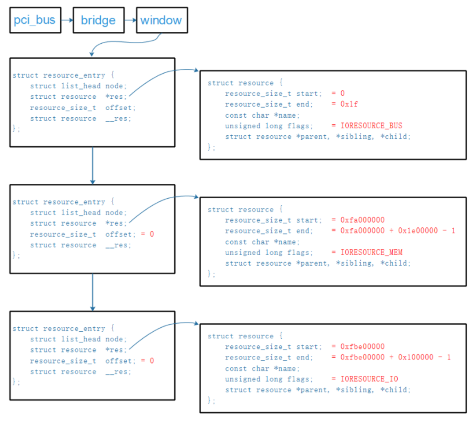 里面记录的start、end等,是基于CPU角度看待的。也就是说,如果记录的是内存地址、IO地址,那么是CPU地址,不是PCI地址。并且这些地址是物理地址,要在软件中使用它们要先执行ioremap。