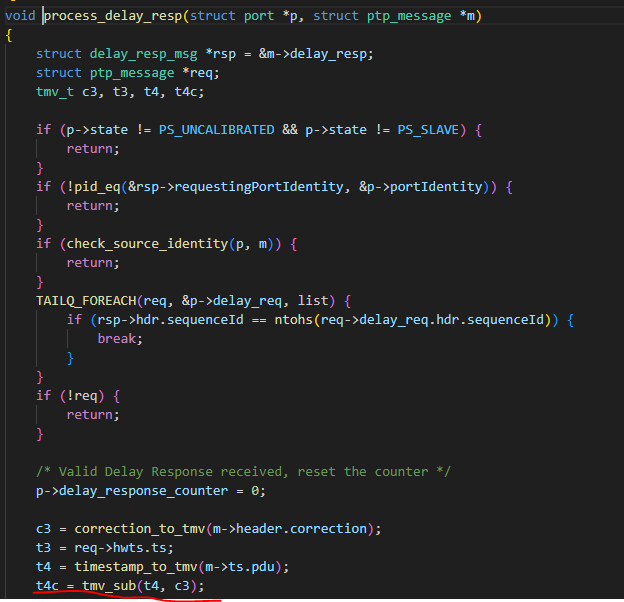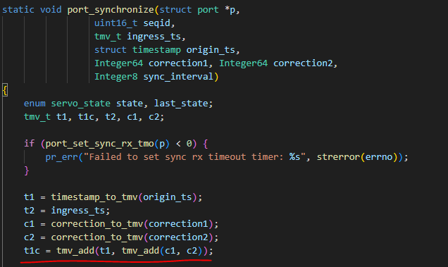 当接收到Follow_up报文时,也就得到了t1和t2两个值,t1会用correction进行纠正,后边计算delay或者offset均使用纠正后的t1,即t1c。