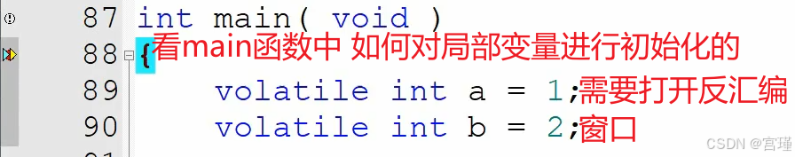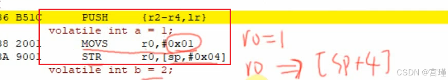 volatile int a = 1; //初始化局部变量,翻译为汇编,对应下面两条汇编指令