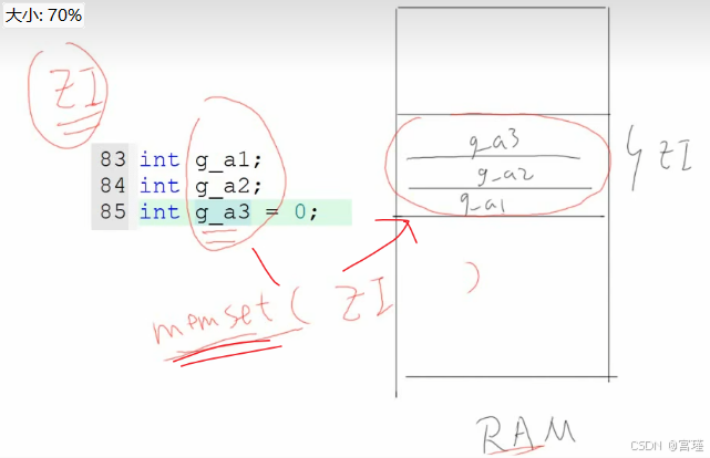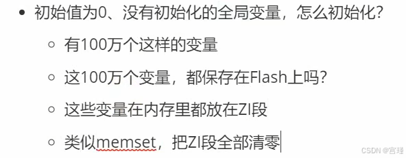 RAM上电时,初始值不确定(但一般是0),在对ZI段初始化时,执行类似memset的操作,将RAM对应的ZI段,全部设置为0.