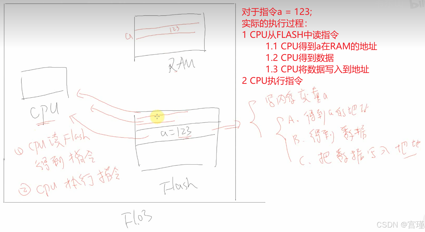 当程序执行时,CPU在FLASH中取指令,当取到int a = 1;时,CPU在RAM内存中开辟4字节空间,存放a的值。