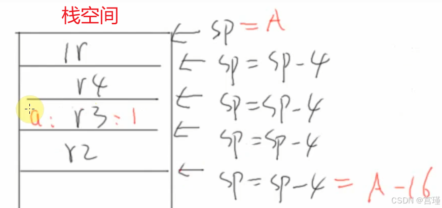 但是如果函数嵌套时,有多个返回地址,所以一个LR就不够用了,所以需要将返回地址保存在栈空间中。也就是RAM的一段空间中。