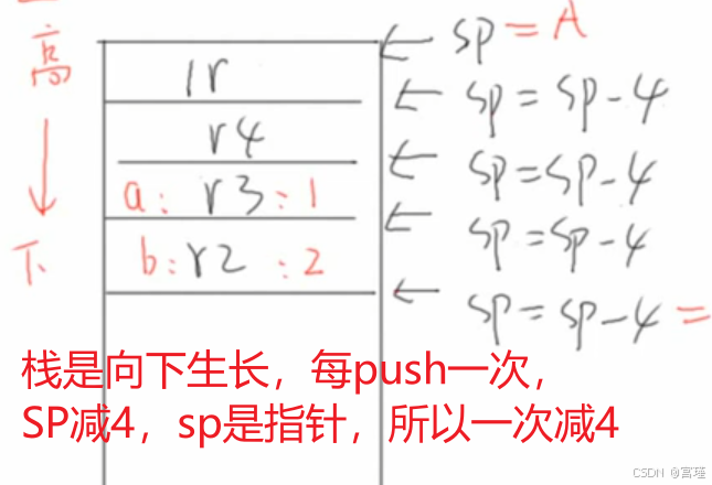 ;因为是32位CPU,CPU内部的寄存器为32位,所以每push一个寄存器,SP栈指针减4。