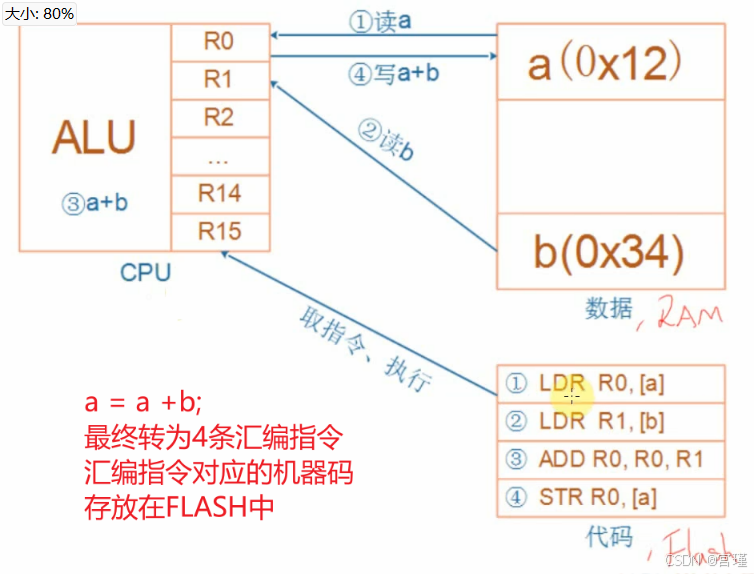 当执行a = a + b时,CPU读出RAM内存中a的值,放在CPU内部的寄存器(或者称为缓存)中,然后读出b的值,计算a+b,把计算结果再放回到a的RAM地址处。