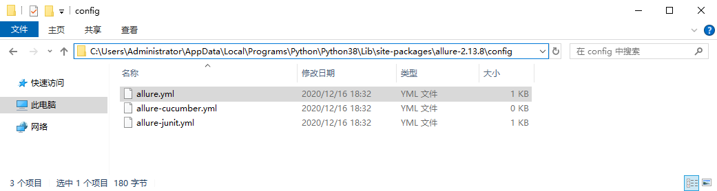 例: C:\Users\Administrator\AppData\Local\Programs\Python\Python38\Lib\site-packages\allure-2.13.8\config