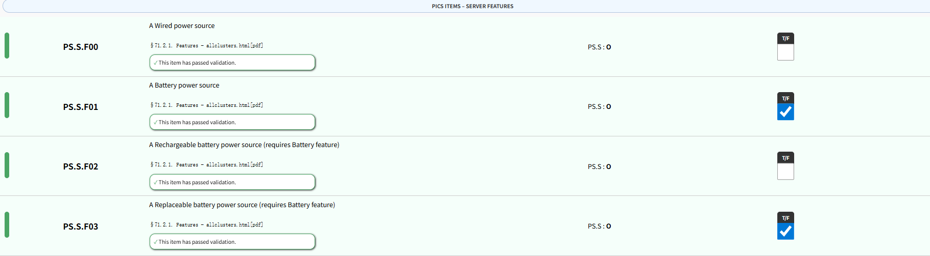 PS.S.F02 - Rechargeable battery power source(可充电电池电源):设备不支持可充电电池(尽管Battery特性已实现,但该特性未选)。