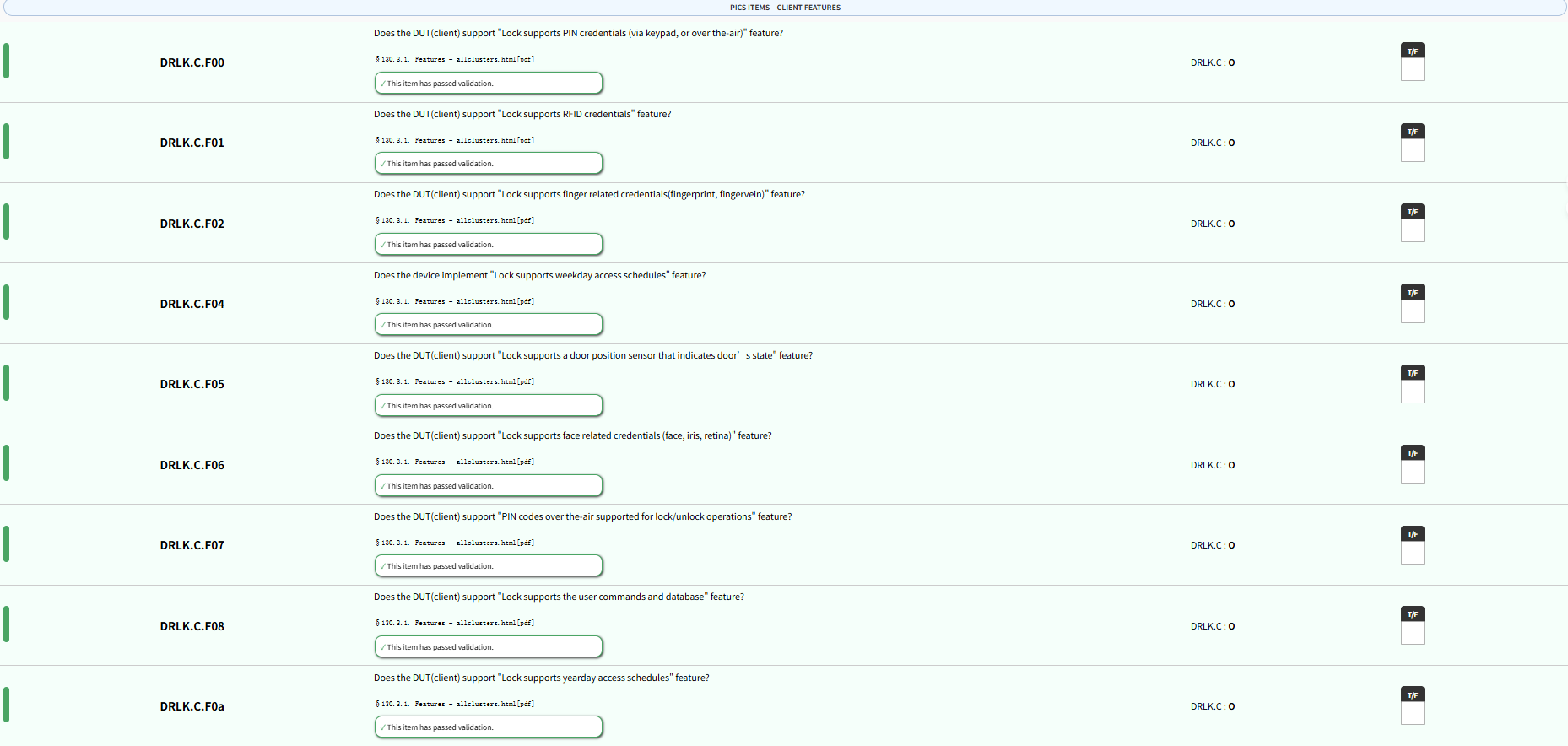 以下是服务器端(Server Side)的功能项(DRLK.S.Fxx),因为设备角色是服务器(DRLK.S support="true"),客户端功能全部未支持(DRLK.C support="false")。每个功能项的含义和选择状态如下:
