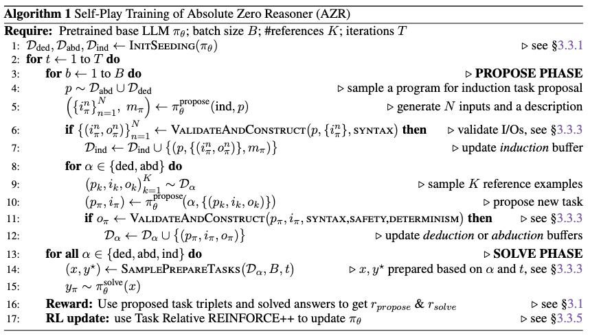 自演化训练课程:引入了"绝对零度推理器"(AZR),该系统能够自我演化其训练课程和推理能力,使用代码执行器验证自我提出的代码推理任务并验证答案。