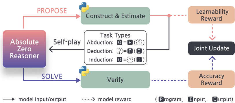 无监督自我对弈推理:提出了"绝对零度"(Absolute Zero)范式,使模型能够在没有外部数据的情况下,通过自我对弈来提出任务并解决问题,从而提高推理能力。
