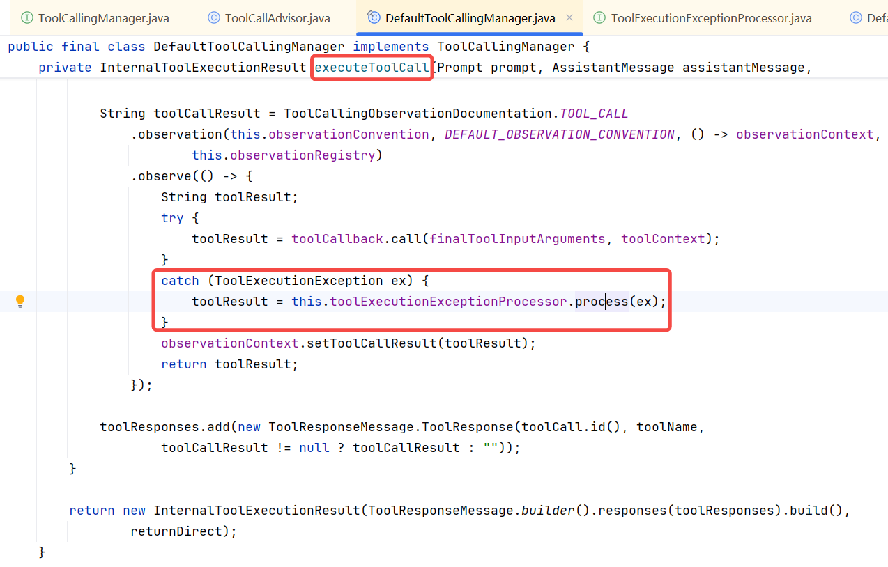 ToolExecutionExceptionProcessor接口会处理ToolExecutionException 异常。如果使用了 Spring AI Spring Boot Starter,则会自动配置DefaultToolExecutionExceptionProcessor作为工具执行异常处理器(会在上图所示的调用逻辑中使用)。