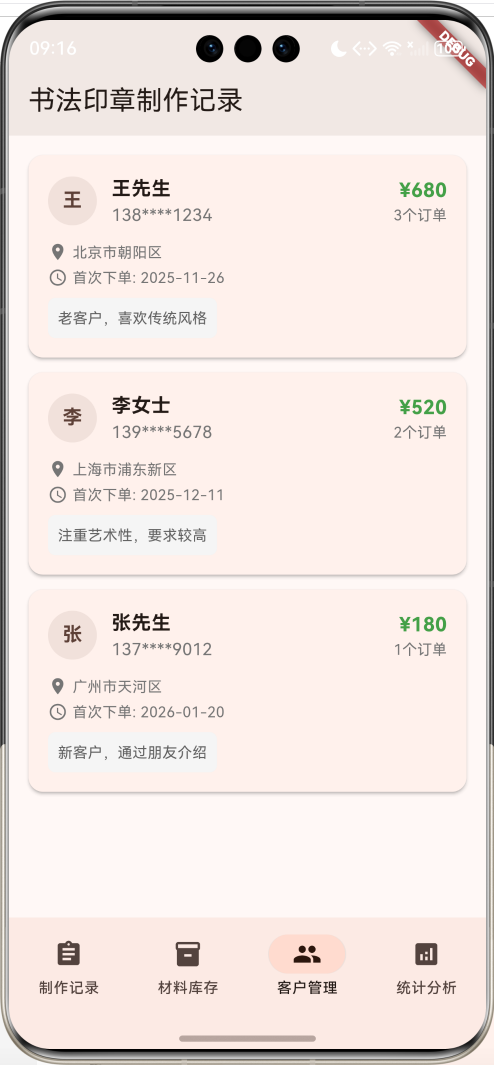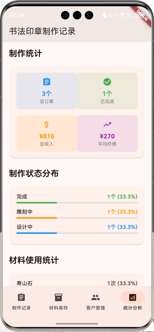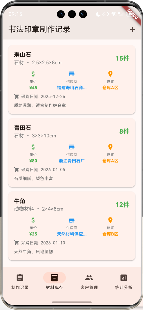 书法印章制作记录应用是一款专为印章制作工艺师设计的管理工具,帮助记录和追踪印章制作的全过程。应用涵盖了从设计到完成的每个制作步骤,同时管理材料库存、客户信息和业务统计,是印章制作行业的数字化管理解决方案。