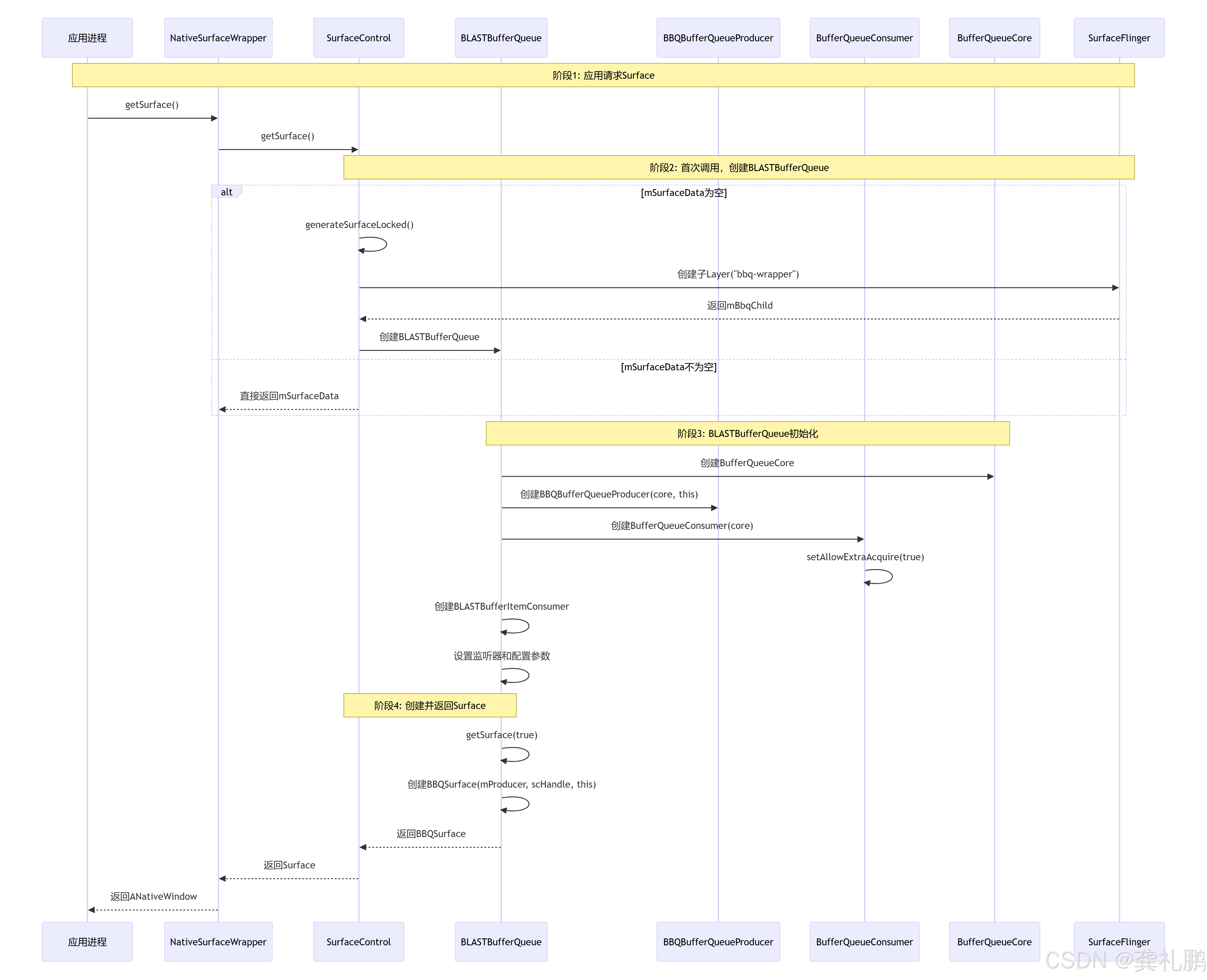 mBbq) :实例化一个BLASTBufferQueue对象,它负责将应用产生的缓冲区(Buffer)数据封装进 SurfaceFlinger 的事务(Transaction)中。 - 获取渲染接口 (