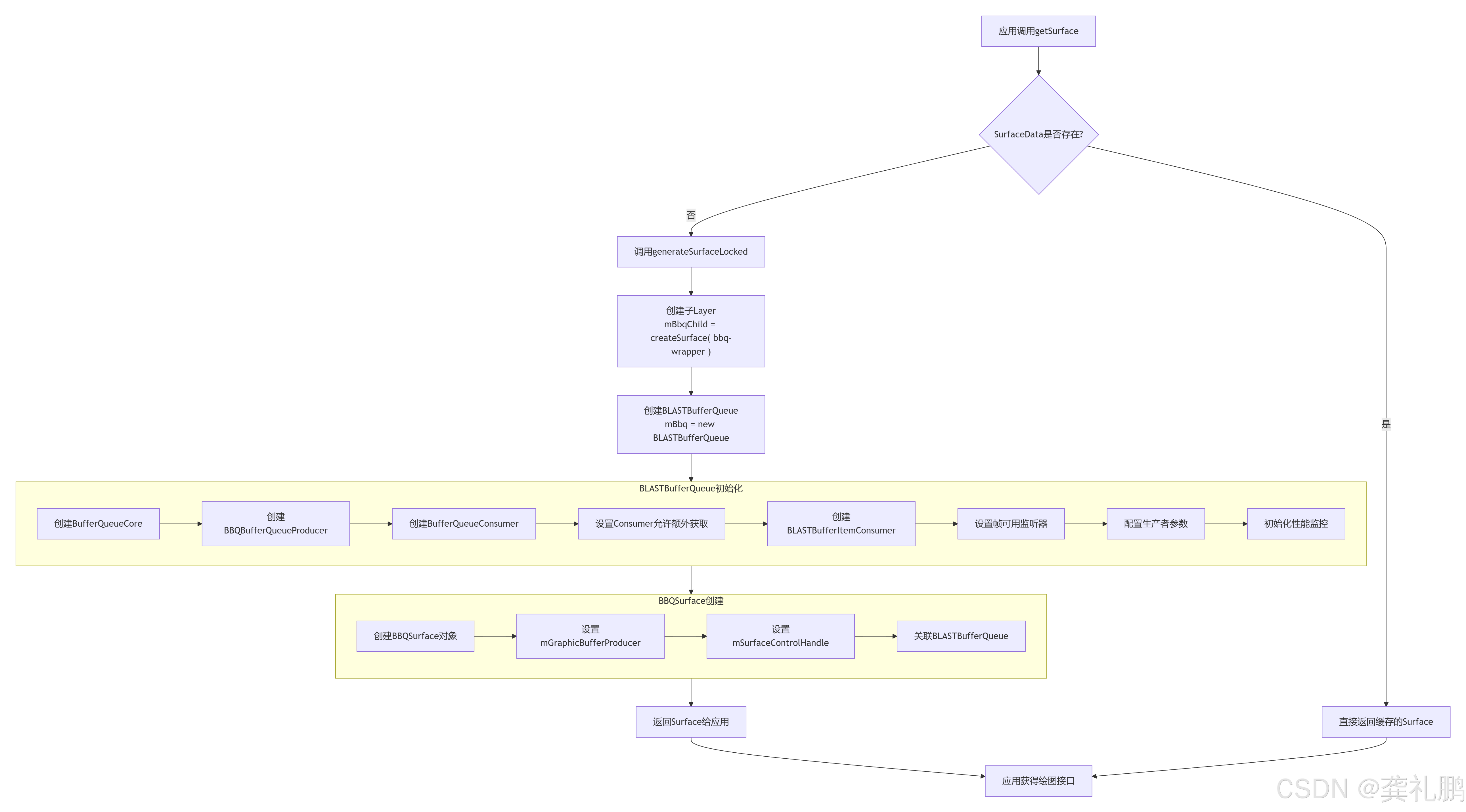 总结 SurfaceControl::generateSurfaceLocked() 的核心逻辑,该函数利用 BLAST 架构将图层管理与数据渲染对接,具体步骤如下: