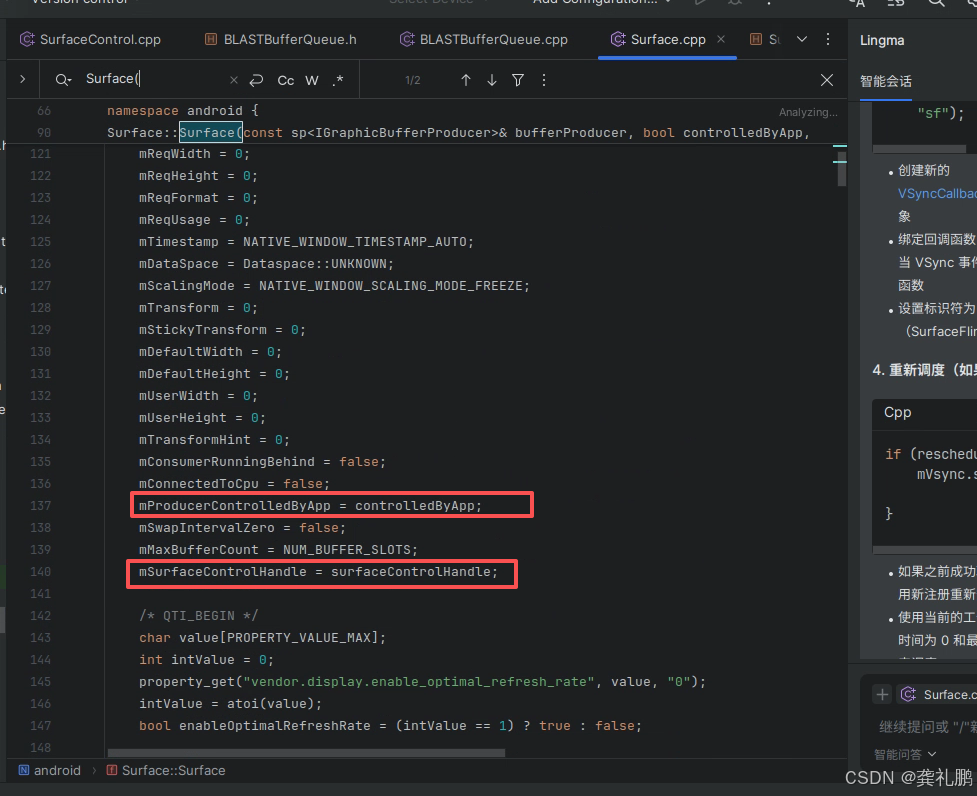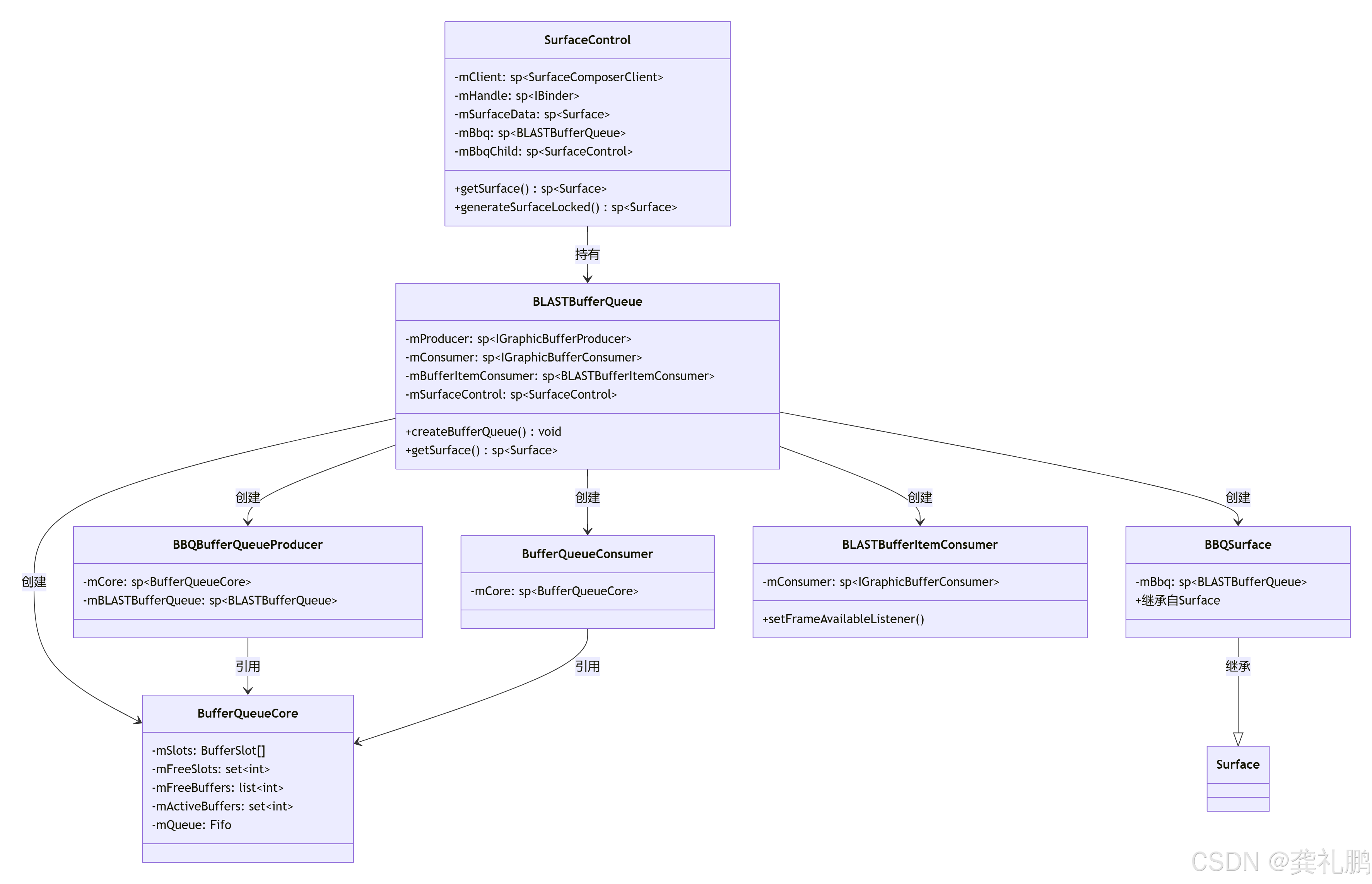 Surface中有: 图形缓冲生产者:mGraphicBufferProducer,这个就是BLASTBufferQueue::createBufferQueue时创建的,并一路传递过来; SurfaceControl句柄: mSurfaceCtrolHandle是 SurfaceControl::generateSurfaceLocked()中mClient->createSurface时获取的,并一路传递下来;