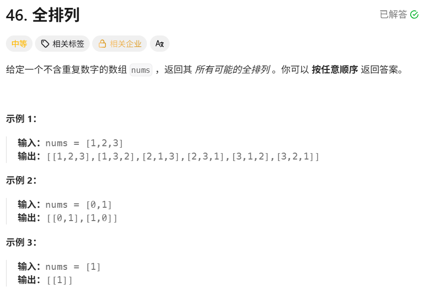 心得:这道题是回溯部分的题,用到了递归的方法,因为每次选数列中数字作为当前第一个,递归后面的排序,比如不会出现重复,得到的就是全部进行排列的结果。但因为每个都是O(n)的时间复杂度,总的为O(n!)。