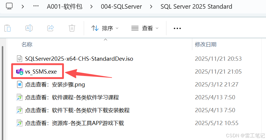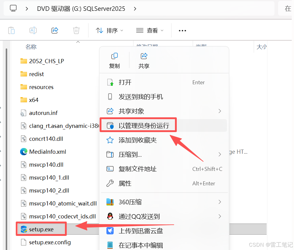 返回安装文件夹,选中【vs_SSMS.exe】文件,右键选择→【以管理员身份运行】。