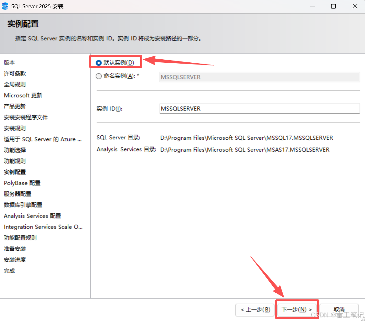 这里保持【默认实例】选择,然后点击【下一步】按钮。