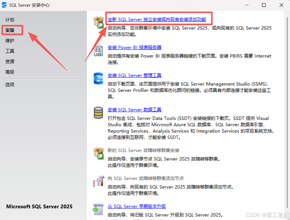 点击【安装】选择→【全新SQLServer独立安装或向现有安装添加功能】。