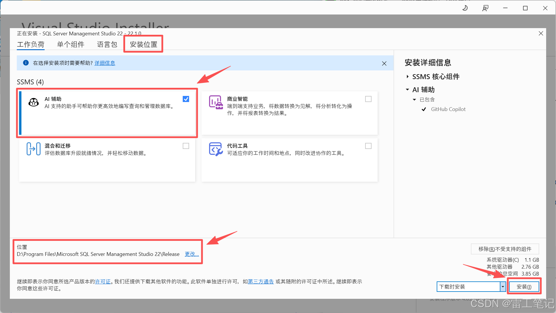 这里勾选了AI辅助,修改安装位置为D盘,然后点击【安装】按钮。