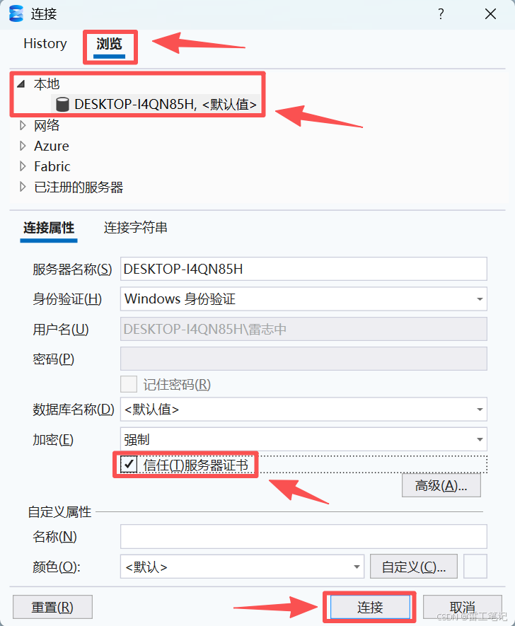 点击【浏览】,选择【本地】,勾选【信任服务器证书】,然后点击【链接】按钮。