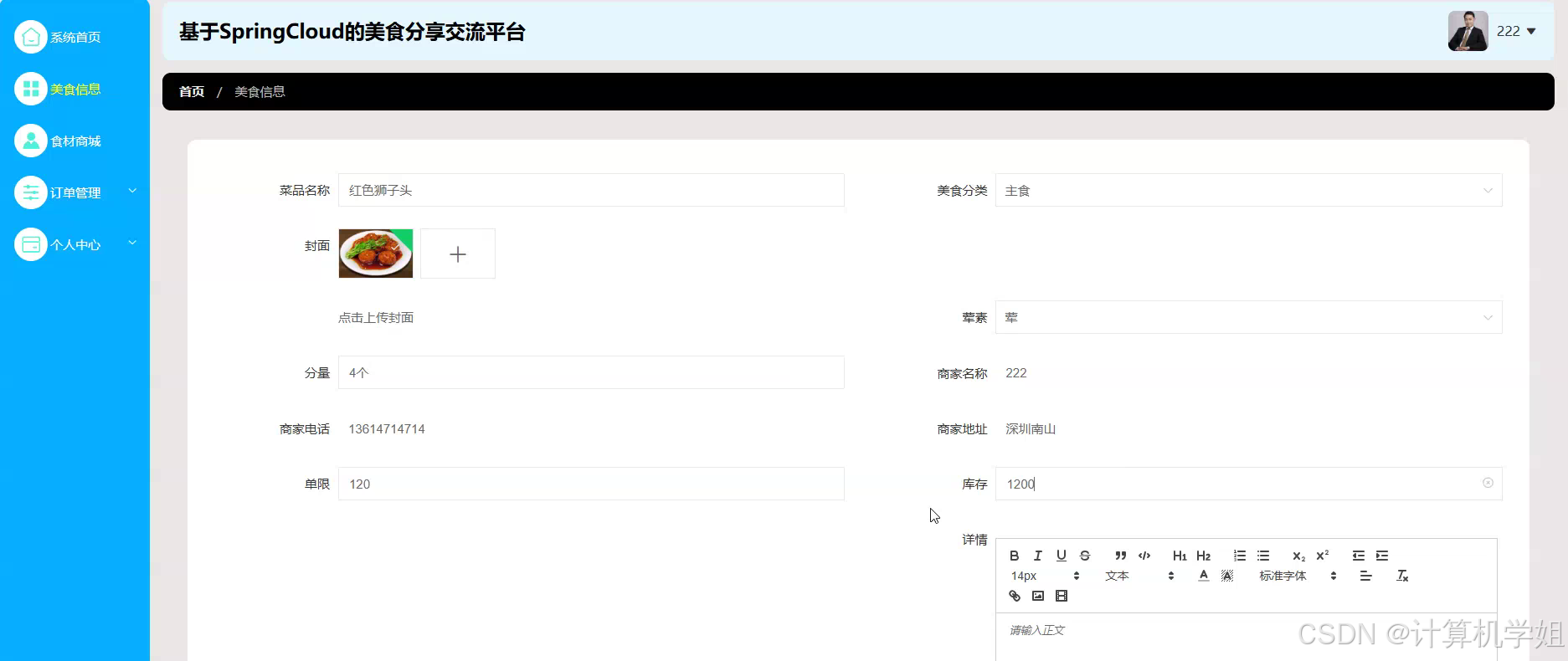 基于SpringBoot+VUE+MYSQL的美食分享交流平台,旨在整合美食资源与用户互动需求,构建一个集美食信息发布、用户交流互动、个性化推荐于一体的综合性平台。平台采用前后端分离架构,SpringBoot作为后端核心框架,提供稳定高效的业务逻辑处理与数据交互能力;VUE框架实现前端页面的动态渲染与交互,提升用户体验;MYSQL数据库负责数据的持久化存储与管理。通过该平台,用户可以轻松发布美食图片、分享烹饪心得、浏览他人动态,并参与话题讨论与评论互动。平台还支持用户个性化设置,如关注感兴趣的美食博主、收藏喜爱的美食菜谱等,以满足用户多样化的美食探索需求。此平台不仅为美食爱好者提供了一个展示自我、交流学习的空间,也为餐饮行业提供了宣传推广的新渠道,有助于推动美食文化的传播与发展。