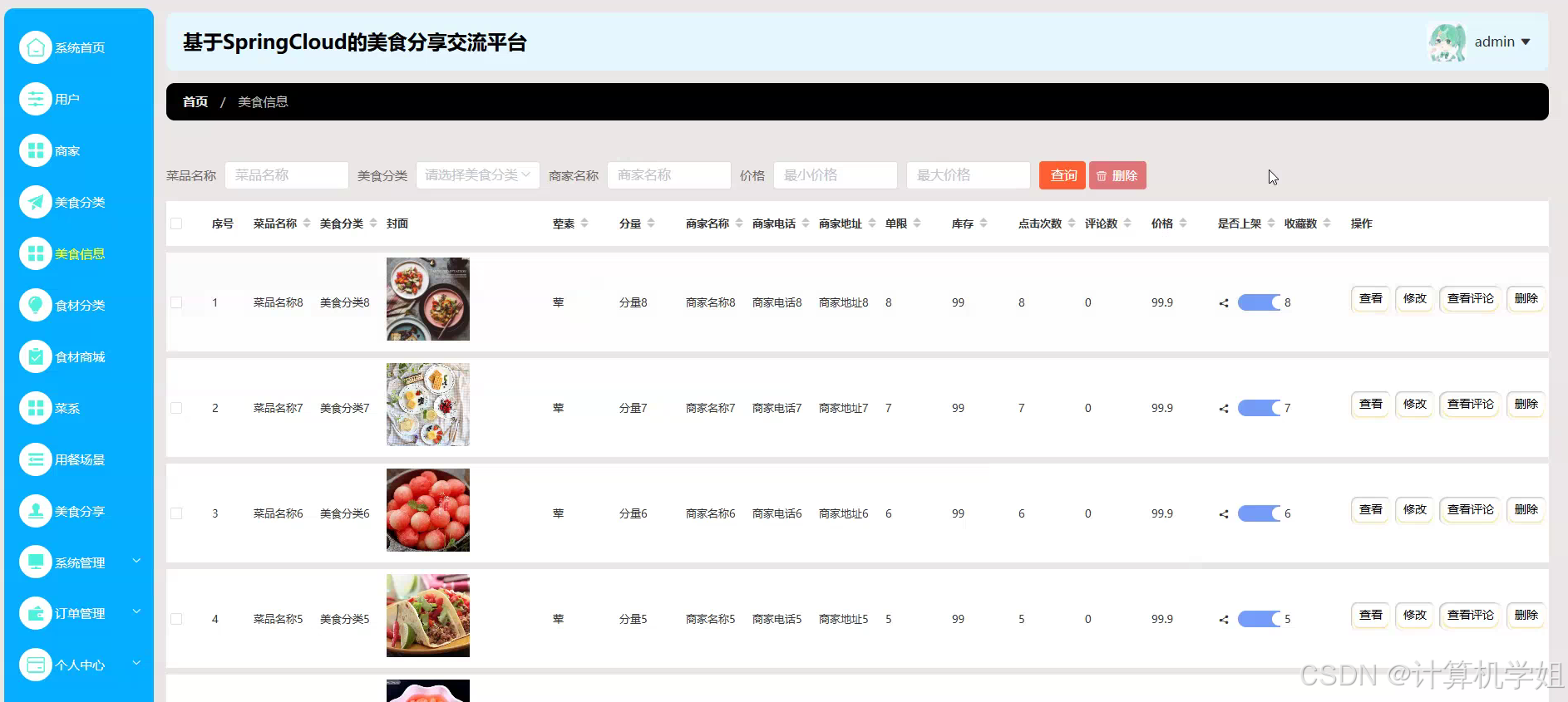本研究旨在设计并实现一个基于SpringBoot+VUE+MYSQL的美食分享交流平台,以满足美食爱好者对于美食信息获取、交流互动及个性化体验的需求。通过该平台,用户可以便捷地发布美食图片、分享烹饪心得、浏览他人动态,并参与话题讨论与评论互动,形成活跃的美食社区。同时,平台将提供个性化推荐功能,根据用户的浏览历史与兴趣偏好,智能推送相关美食内容,提升用户体验。此外,平台还将支持商家入驻,为餐饮行业提供宣传推广的新渠道,促进美食文化的商业转化。本研究期望通过构建这样一个综合性的美食分享交流平台,不仅为用户提供一个展示自我、交流学习的空间,也为餐饮行业提供一个与消费者直接互动的平台,有助于推动美食文化的传播与发展,促进美食产业的创新升级。通过本项目的实施,可以探索前后端分离架构在美食类应用中的实践应用,为相关领域的技术发展提供有益借鉴,同时满足社会对于美食文化交流与分享的需求,提升公众的生活品质与幸福感。