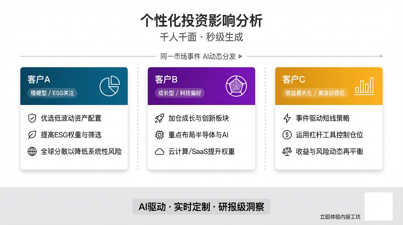 内容是连接高净值客户的生命线,但传统投顾内容的生产模式难以兼顾规模与个性。生成式AI则化身为一个永不疲倦的"内容工坊"。试想在2026年,当重大市场事件发生时,AI不再是推送一篇千篇一律的解读文章,而是能够在数秒内,为每一位高净值客户生成一份高度定制化的影响分析报告。