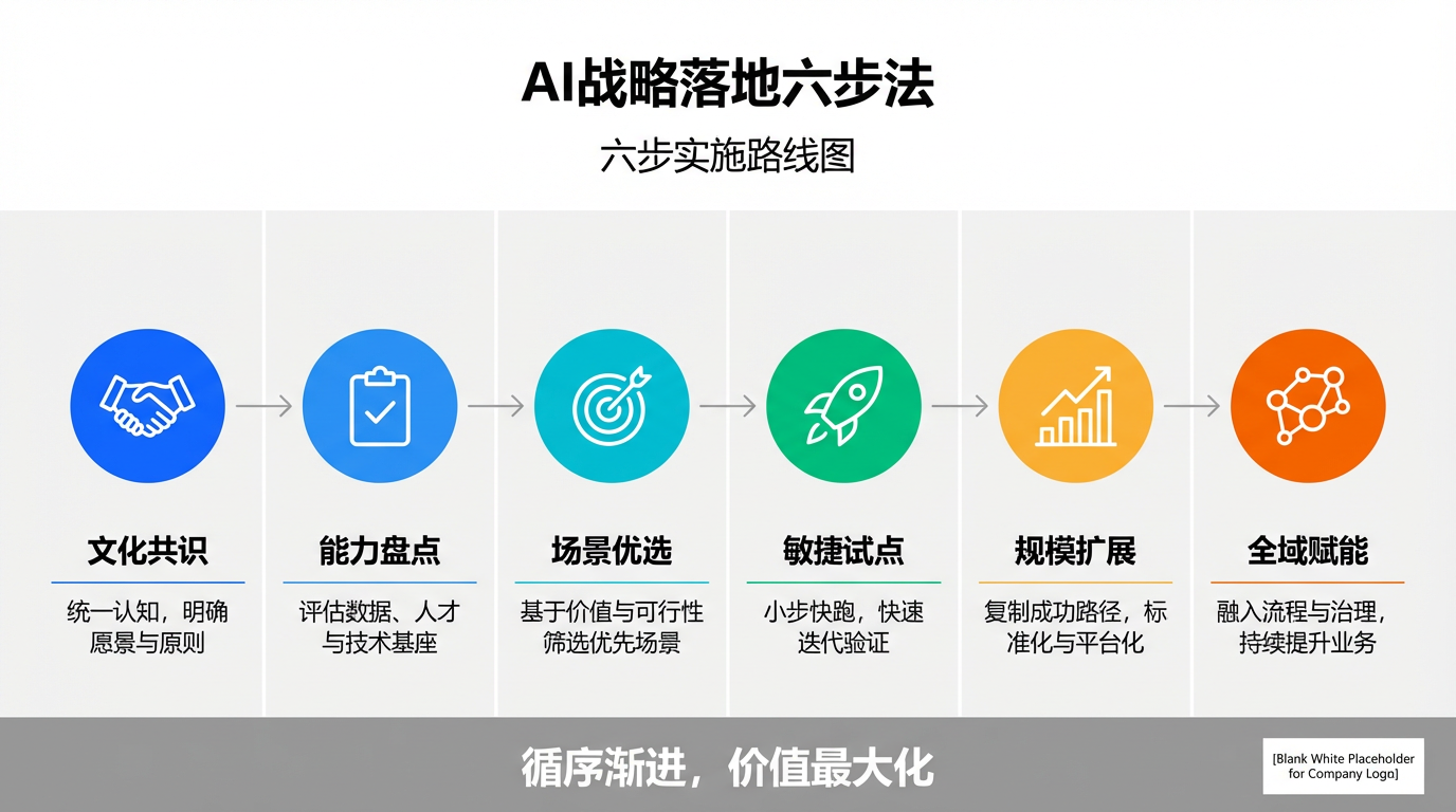 A4: 建议分六步实施:1)建立AI驱动的文化共识;2)选择关键业务场景进行试点;3)准备好数据与技术基础;4)对接成熟的模型与工具;5)利用私域数据建设专属的智能体矩阵;6)通过培训和流程复制,将成功经验推广至全公司。