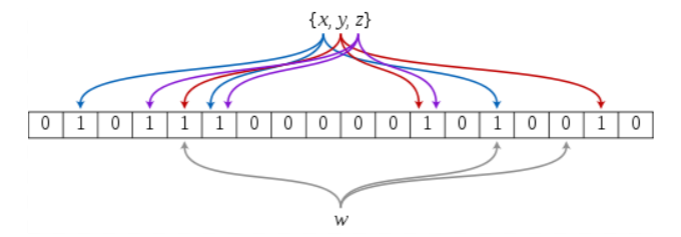 将一个字符串使用多种方式映射到不同的位置上,只有当一个字符串进行查询时,每一个方式都可以对应上即说明这个字符串是对应的字符串,但是也会出现误判的情况,但是此时的误判率大大降低。