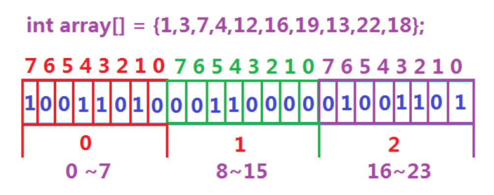通过在顺序表中保存int的值,一个int有4个字节也就是代表32个值,如果需要存储例如80,只需要用80 / 32 = 2,也就是80在下标为2的int值中的第80%32的bit位置。