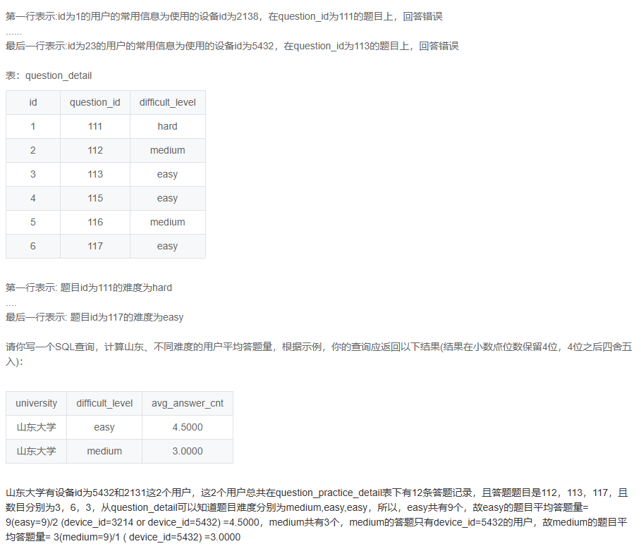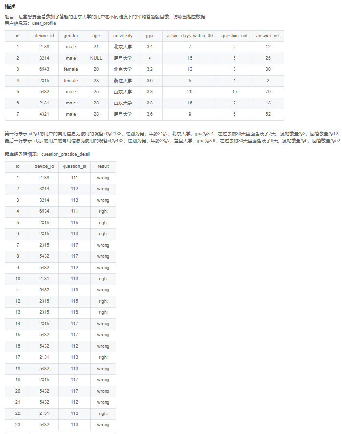 user_profile u:用户信息表(设备 ID、学校等)question_practice_detail qpd:答题记录表(设备 ID、题目 ID 等)question_detail qd:题目信息表(题目 ID、难度等级等)