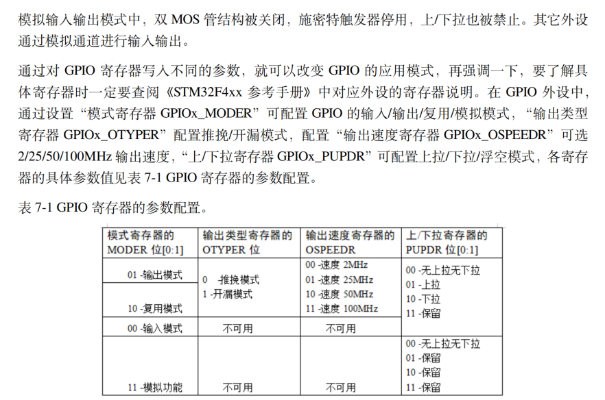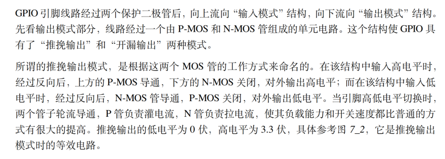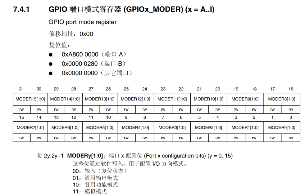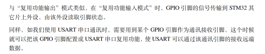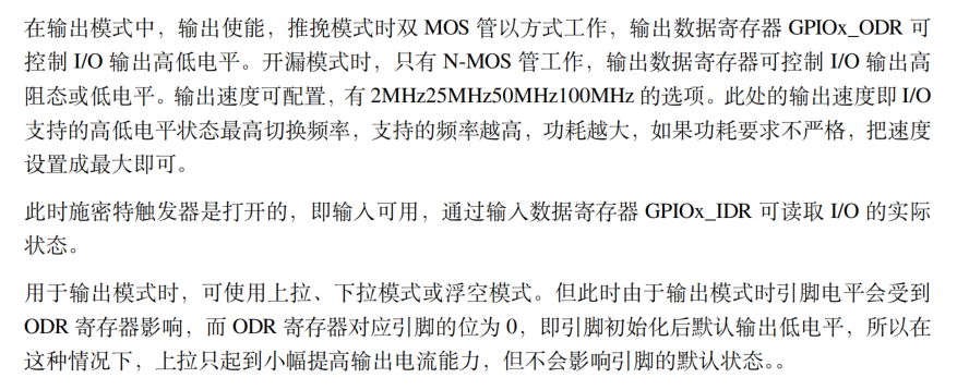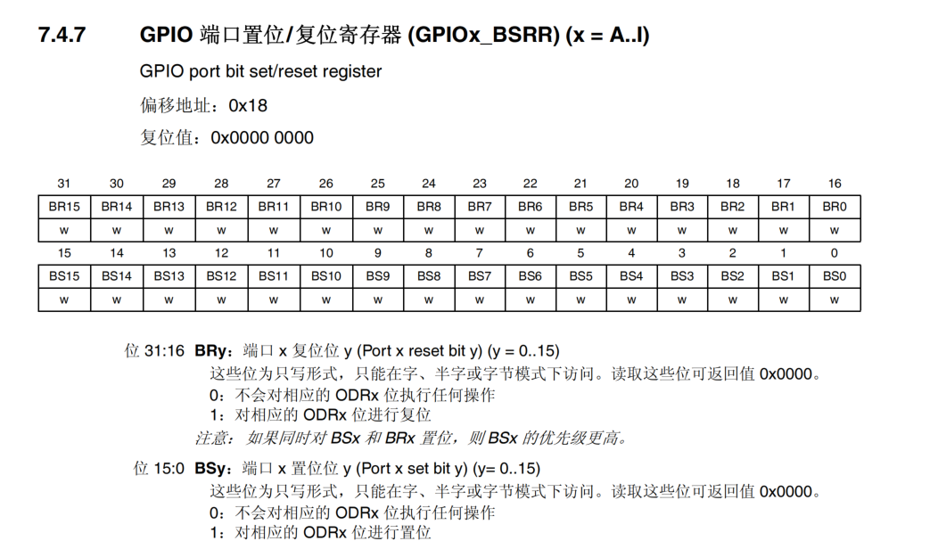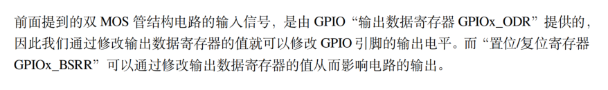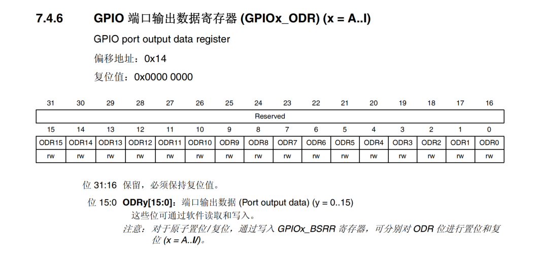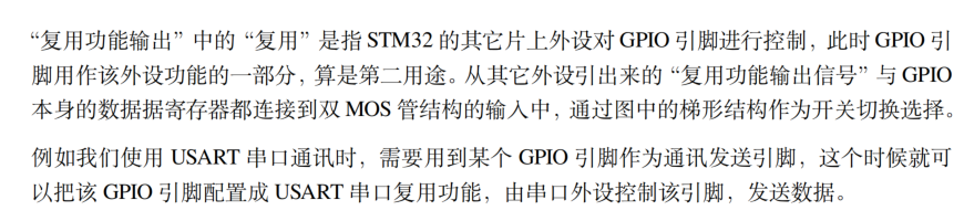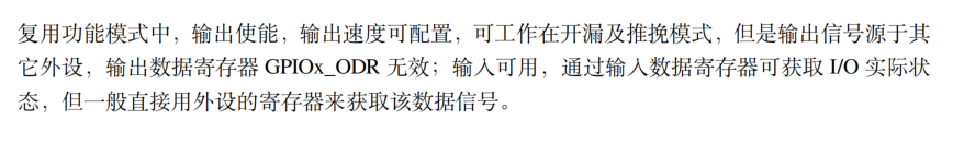 以上说的输出模式都是通用输出模式,复用功能模式的输入输出就是片上的外设来控制IO口了,另外复用输出时,就是片上外设直接控制输出数据寄存器了(ODR),不用置位/复位寄存器了。