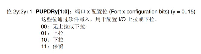 PUPDR0[1:0]= 两位二进制数(bit1、bit0 组成)这两位合起来编码含义(你截图里那张表):