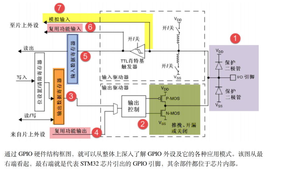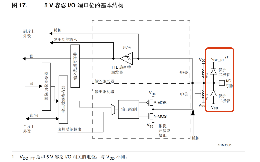 如输入电压大于5V,则通过上面的保护二极管;如输入电压小于0V,如-1V,则由VSS经下面的二极管从I/O出去。