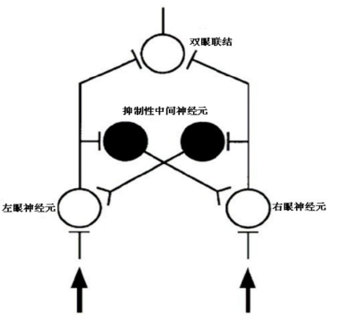 一些研究认为双眼竞争发生在视觉通路的早期阶段,如V1区和外侧膝状体,有相关的脑研究支持了该观点,当一只眼睛的神经元被激活时会通过抑制中间神经元抑制另一只眼的,如图2(Lehky,1988)。