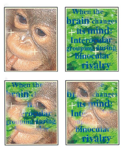 而另外一些理论认为,竞争发生在视觉通路的晚期阶段,涉及到高级认知加工机制对视觉输入的解释,如额顶叶皮层。Kovács等人(Kovács,Papathomas,Yang和Fehér,1996)使用如图3的刺激作为双眼竞争的测试材料,如左眼呈现部分猴子和部分文字的混合刺激,右眼呈现剩余的猴子部分和剩余的文字部分的混合刺激(左眼猴子部分与右眼猴子部分整合起来为一张猴子的完整图片;同理,双眼整合可以得到一张文字的完整图片)。而实验结果显示,被试知觉到的是完整猴子图片或完整文字图片(两张图片之间的竞争),而不是左眼刺激和右眼刺激的竞争。这表明,两只眼的信息进行了整合,并形成完整的有意义的知觉表征后,表征之间再发生竞争。由此证明了双眼竞争发生在视觉的晚期阶段。在Sheinberg和Logothetis(1997)的实验中,对被试的一只眼呈现横条纹,而另外一只呈现竖直条纹。在被试观察的过程中,实验者会交换两只眼的刺激(如一只眼原来看的是横条纹,交互后看到的是竖直条纹,另外一只眼相反)。如果双眼竞争发生在视觉通路的早期,那么被试除了会知觉到双眼竞争现象外,还应该在刺激交换的那一刻知觉到主导眼的刺激发生了变化,而实验结果显示被试没感觉到这种交换变化。因此否认了双眼竞争发生在视觉早期阶段的假设。Leopold和Logothetis(1996)认为,低级皮层主要负责视觉的编码和传输,受意识的影响程度较少,只有很少一部分神经元会在双眼竞争的时候有反应。
