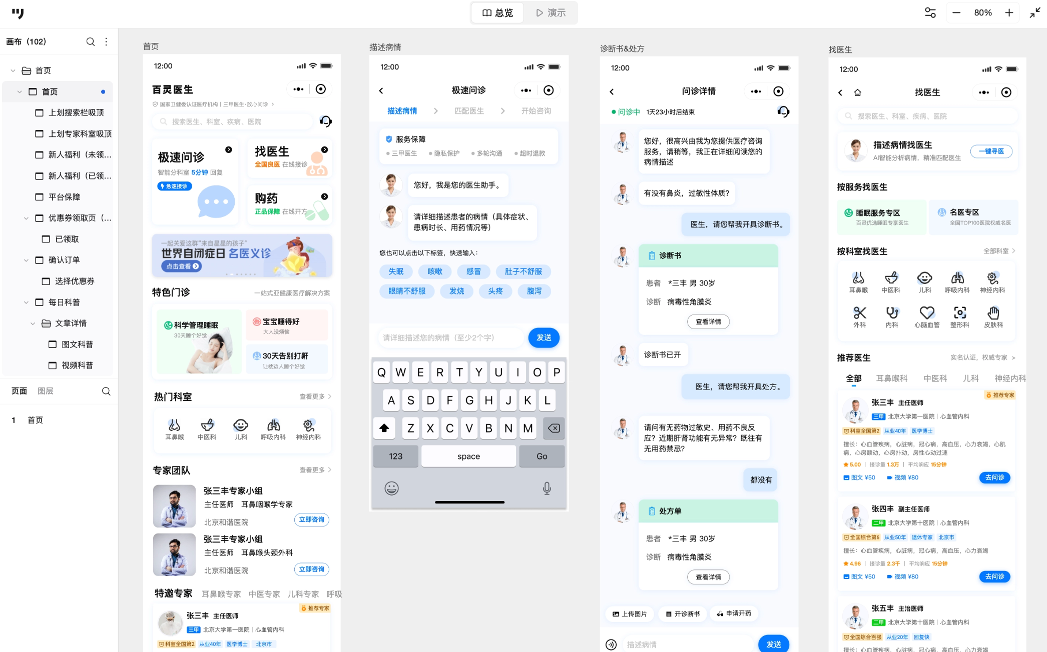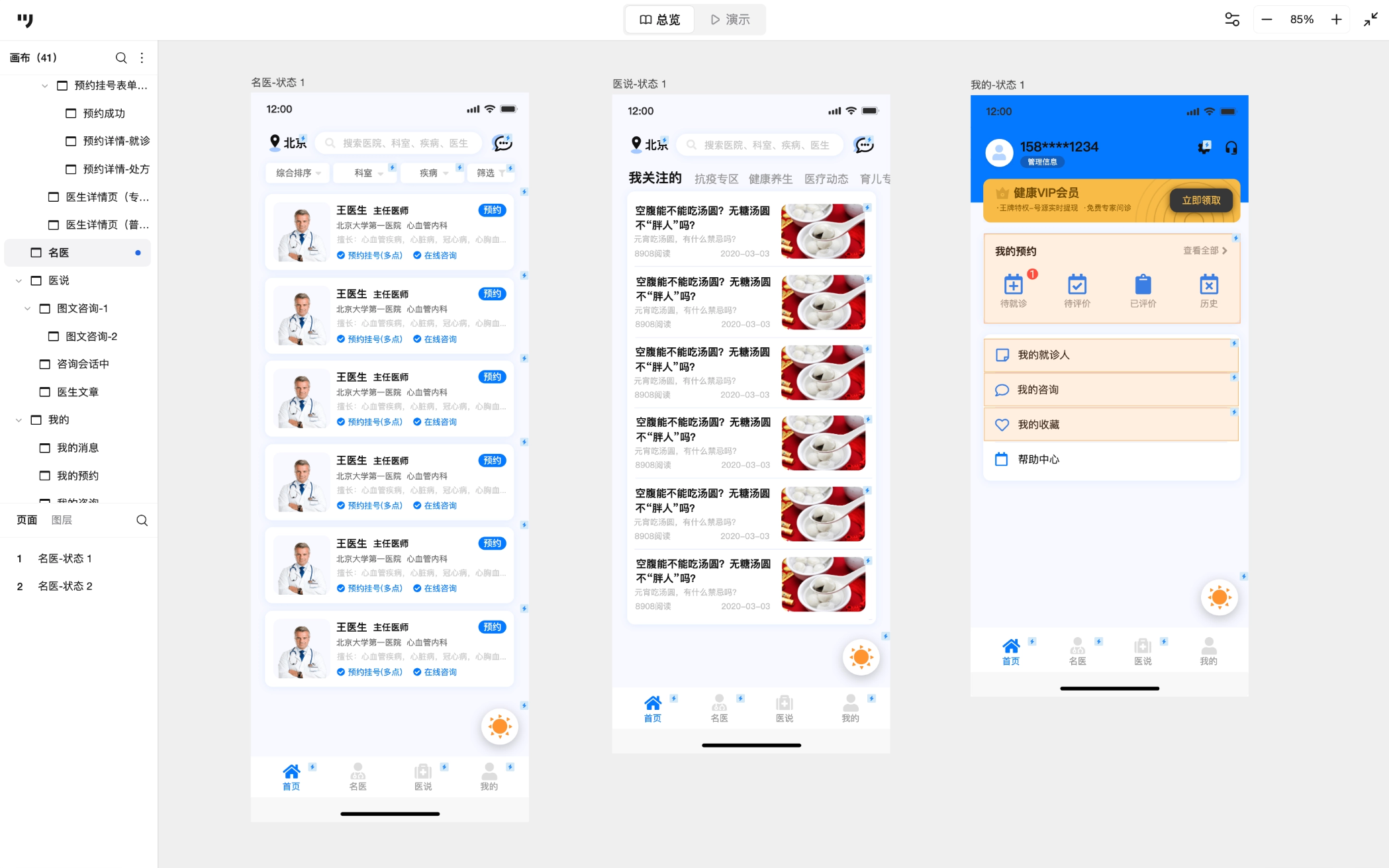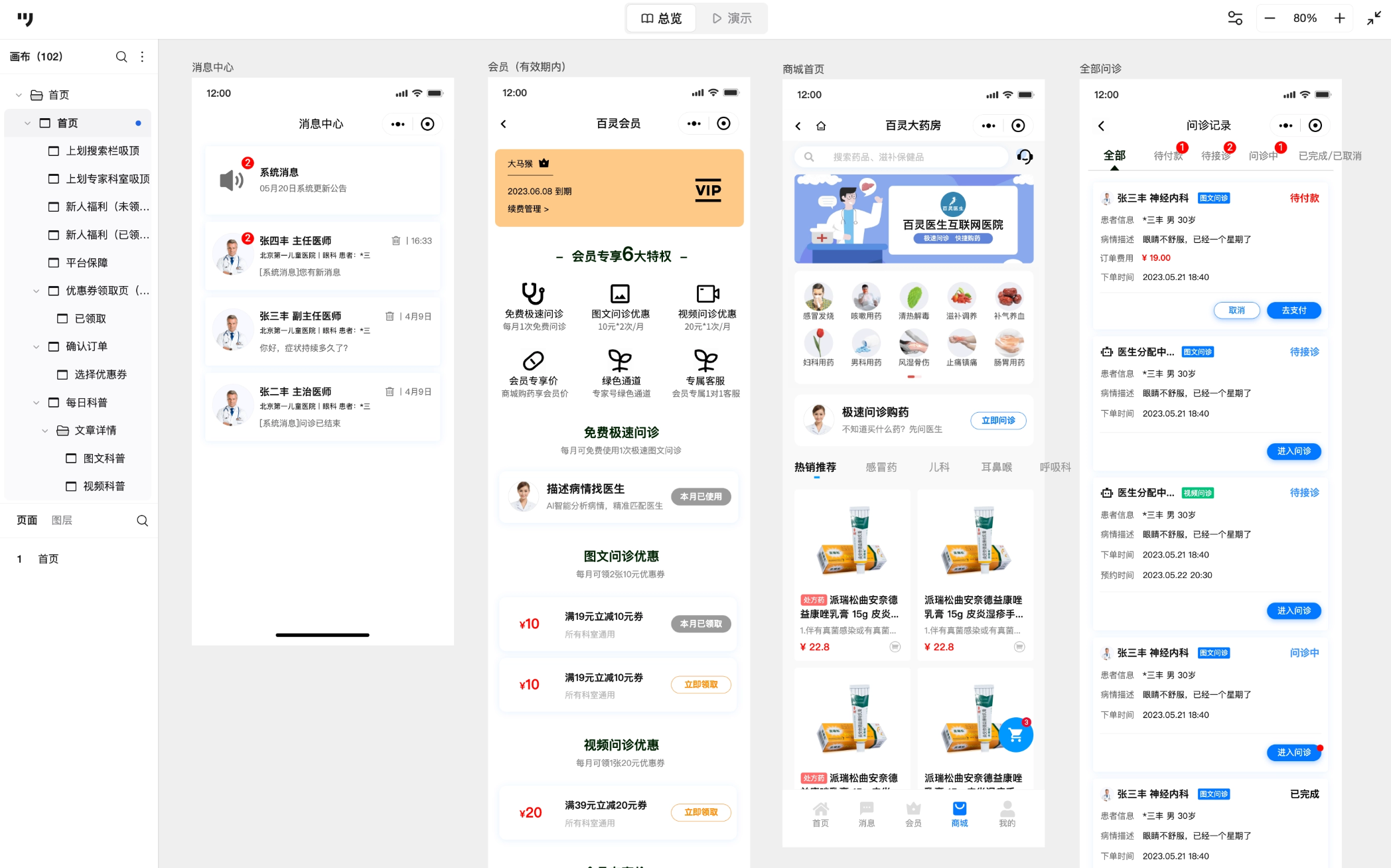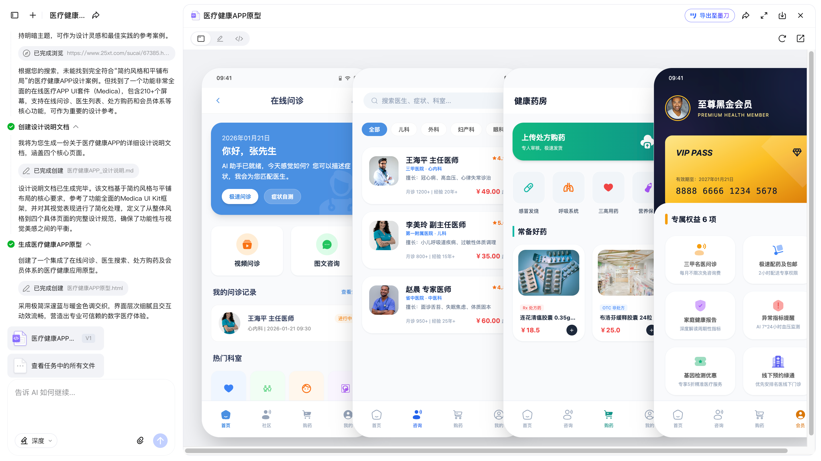 "生成一套包含在线问诊、医生列表、处方购药、会员体系的医疗健康APP原型"