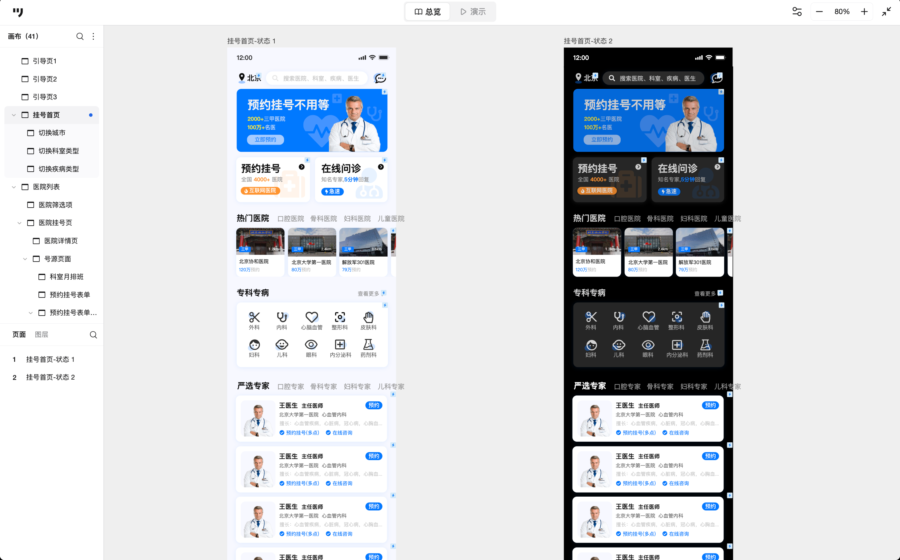 这个设计巧妙地将线上和线下服务打通了。当用户想挂的线下号没了时,"在线咨询"的按钮就变成了一个高效的流量承接入口,不仅防止用户流失,还盘活了医生的碎片时间,提升了平台整体效率。同时,该原型支持浅色/深色两种模式,在医疗高频使用场景下,有助于缓解长时间使用的视觉疲劳。