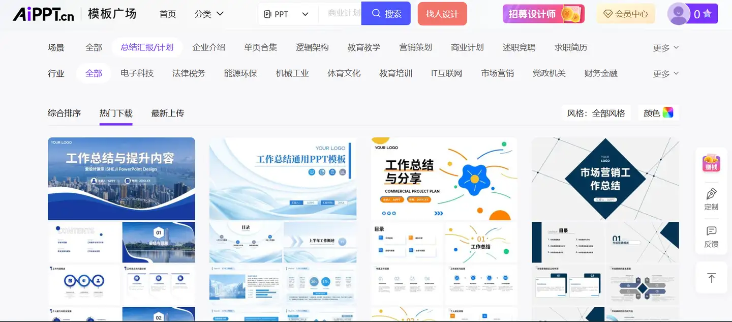 不仅是AI生成,AIPPT站内还有20w+设计模板。访问AIPPT的【模板广场】版块,就能开始挑选喜欢的PPT模板使用了。关于年度汇报PPT,站内做了一个垂直的分类,访问模板广场后可以直接查看PPT模板下的总结汇报部分。