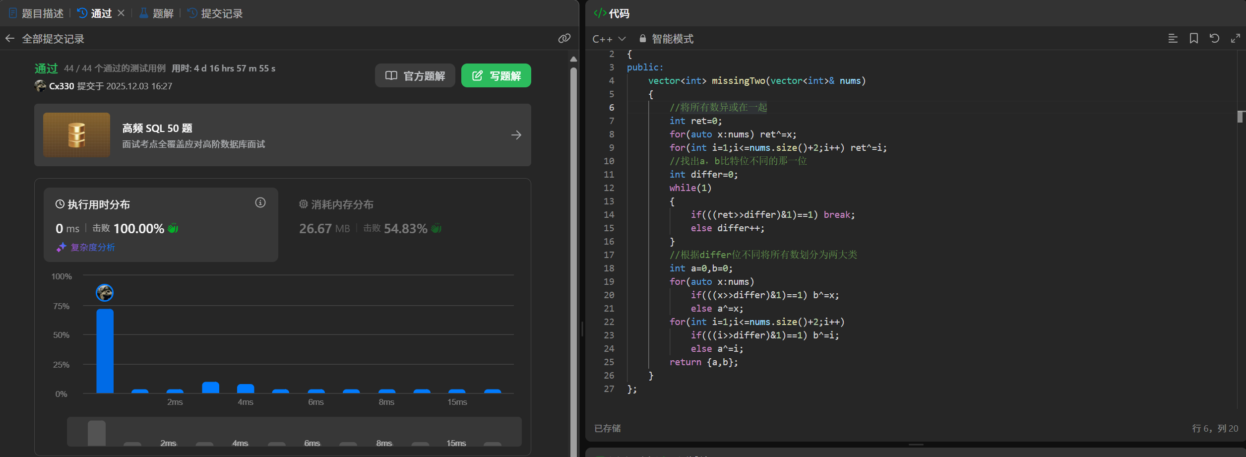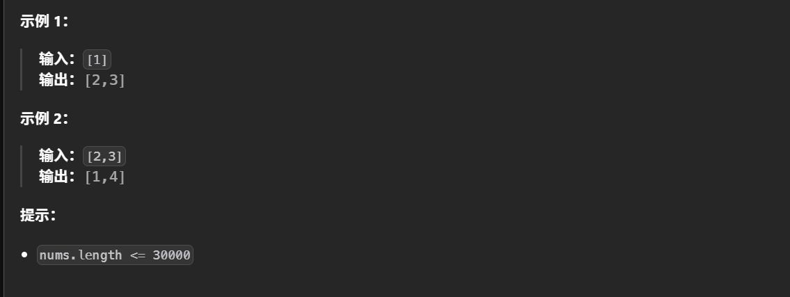 先将数组中的数和【1,n+2】区间内的所有数**【异或】**在一起,问题就变成了:有两个数出现了【一次】,其余所有的数出现了【两次】。进而变成了 260.只出现了一次的数字||| 这道题