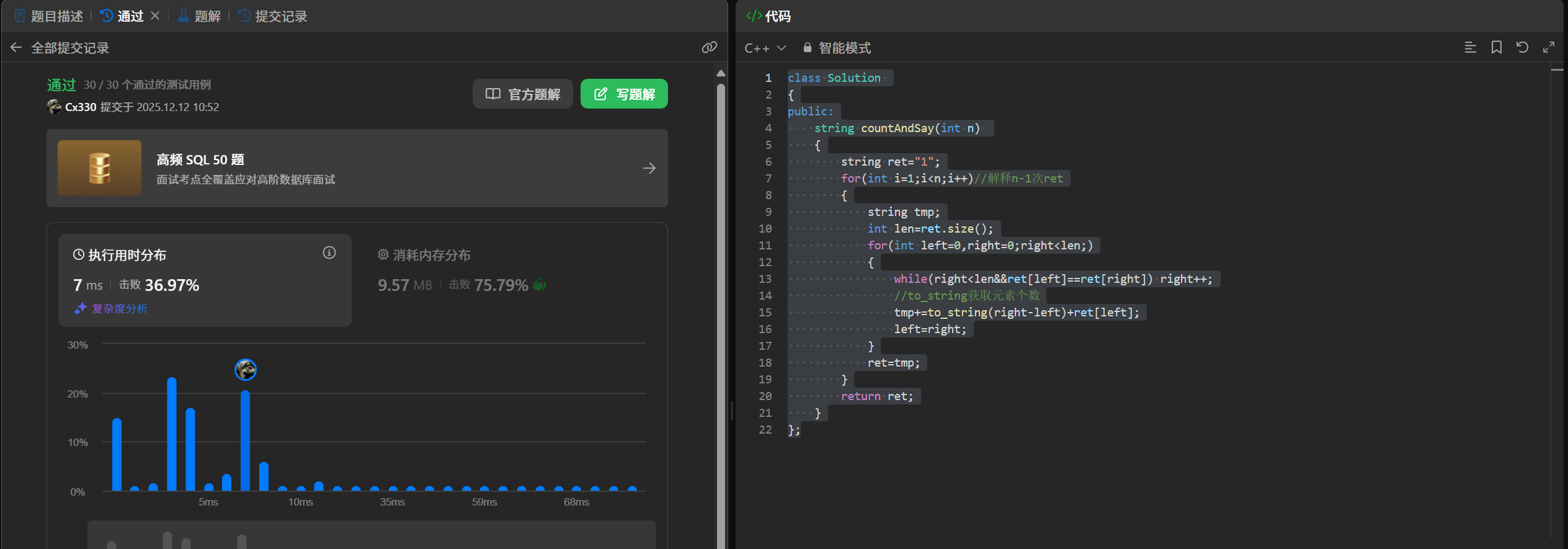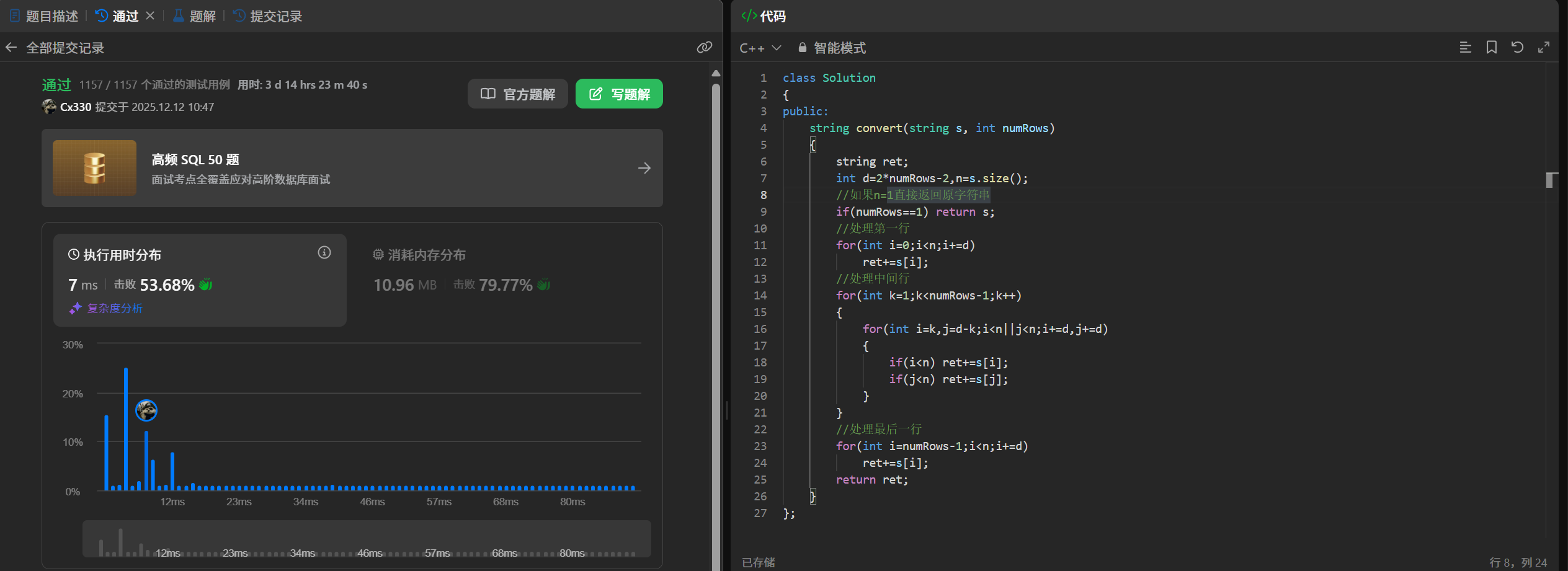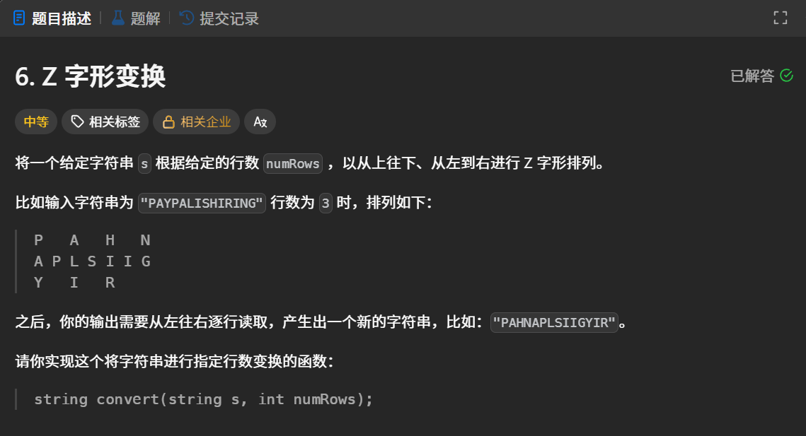 结语:本文分享了两个算法题的解题思路和C++实现。首先针对"Z字形变换"问题,通过观察字符排列规律,采用周期模拟法将字符串按特定顺序重组。其次解决"外观数列"问题,通过统计连续相同字符个数生成新字符串。两题均采用模拟解法,文章以实战为导向,简洁明了地展示了从问题分析到代码落地的完整过程。