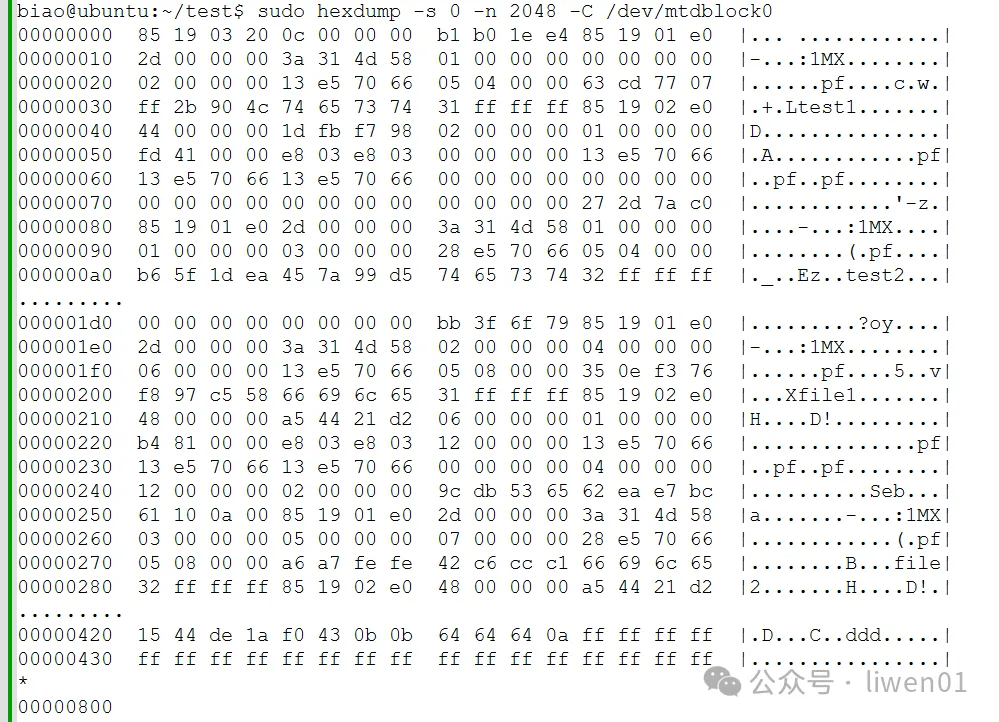 - 使用hexdump查看mtdblock0节点前面2KB的数据,数据如下(...中为省略部分)