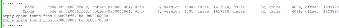 Inode node at 0x0000042c, totlen 0x0000004e, #ino 6, version 2, isize 38, csize 10, dsize 22, offset 16