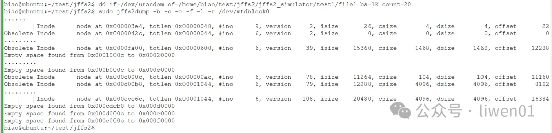 上面我们写的全0数据是很容易压缩,所以实际保存的数据要比文件小很多。这里我们写入随机数,让数据记录快速写满整个分区空间,看jffs2是如何进行垃圾回收的。