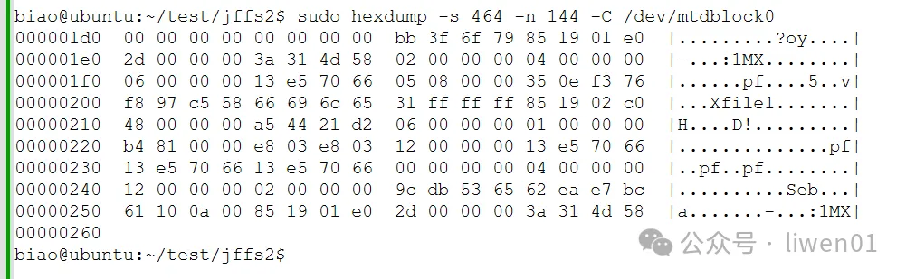 可以看到/dev/mtdblock0设备节点上的数据与jffs2.img镜像文件上的数据信息是一致的。